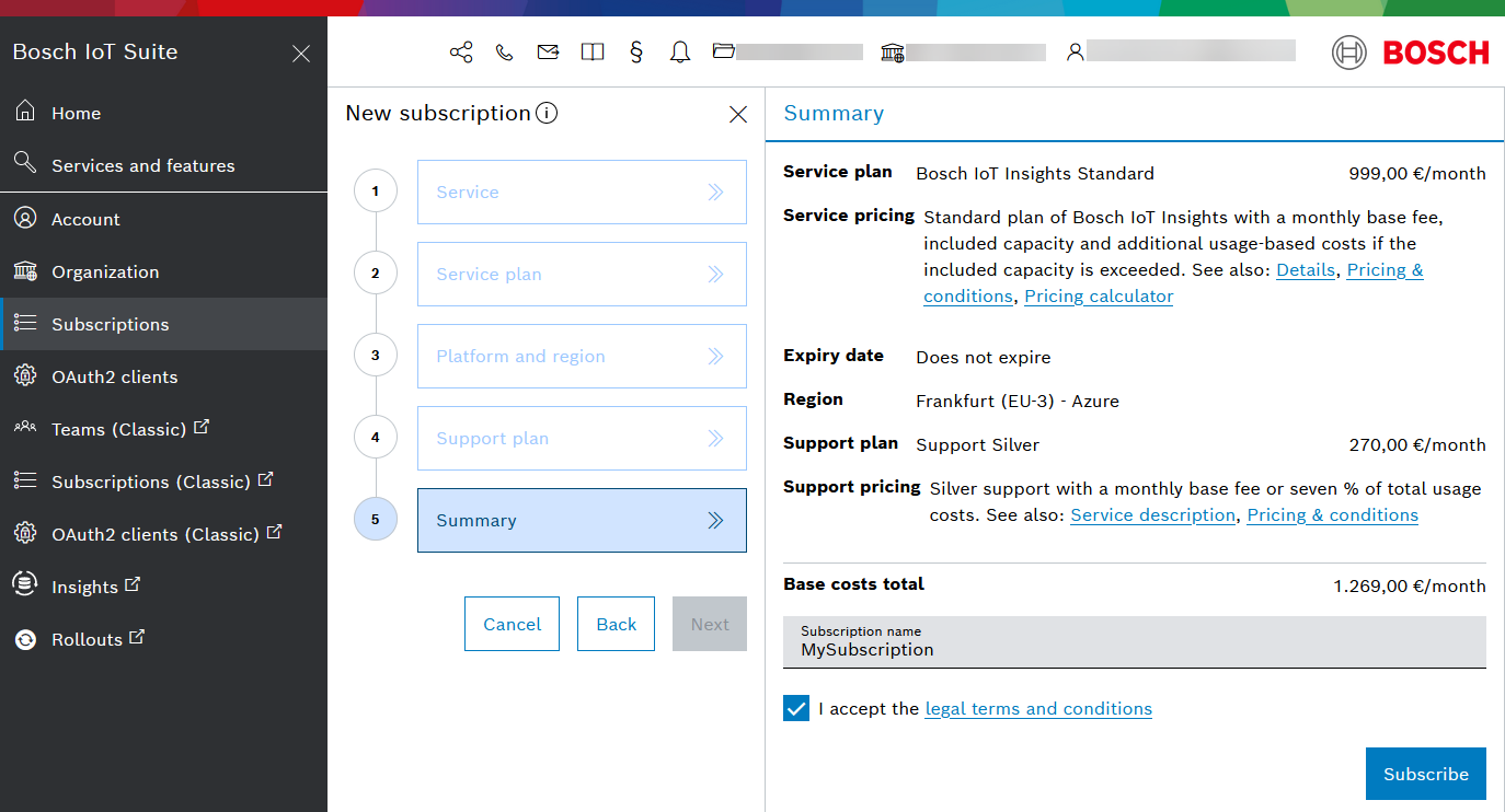 - Bosch employees can configure the cost center on the organization and then order paid subscriptions.