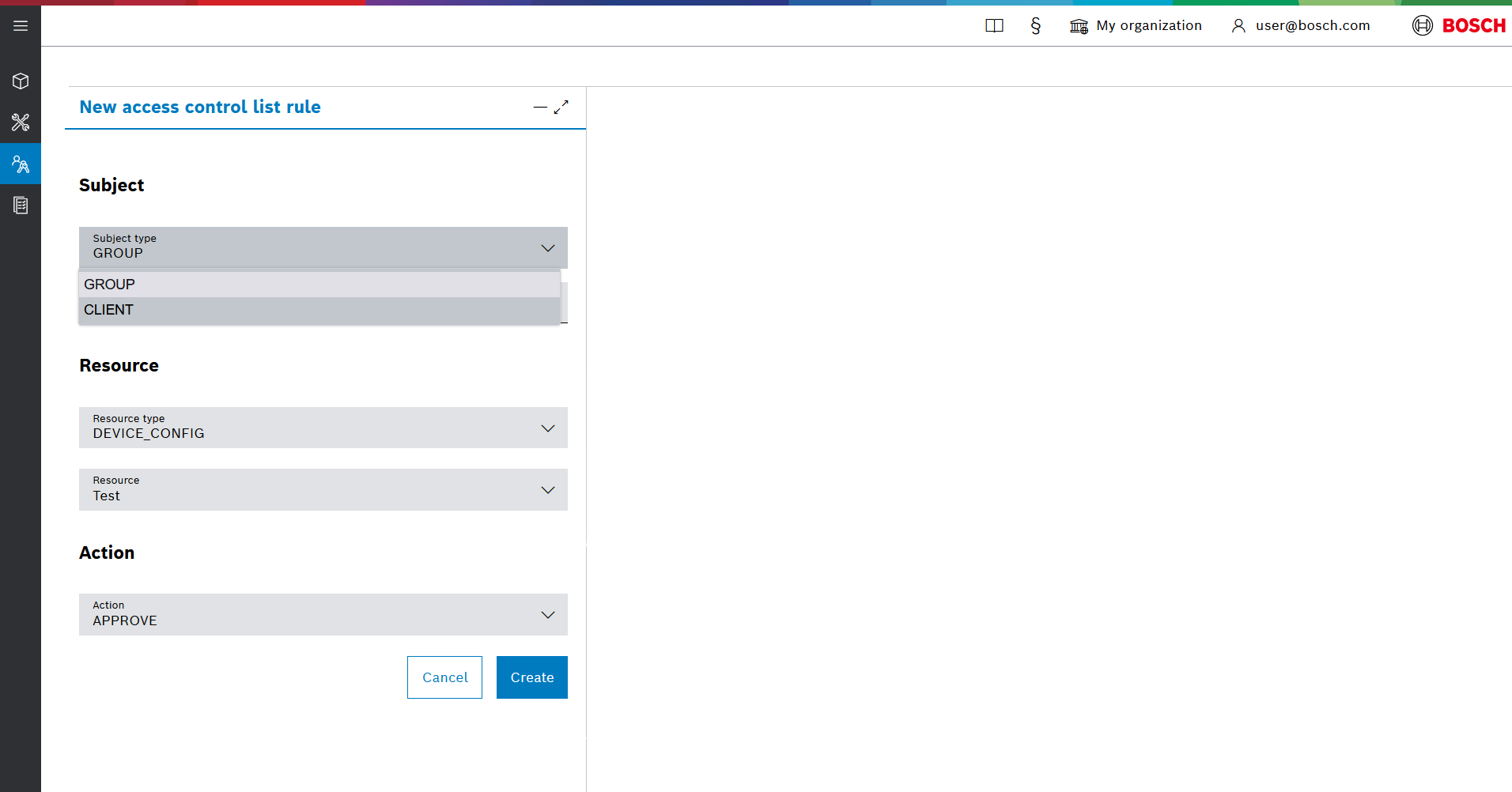 - Select the Subject type that will use the rule. Can be GROUP (when authenticating with an IdM role) or CLIENT (when authenticating with an OAuth2 client).