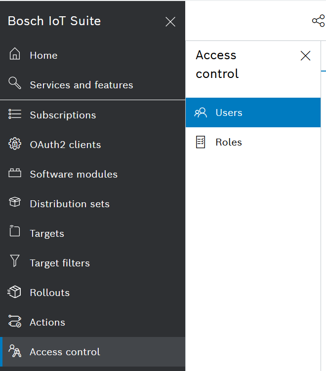 The Access Control UI feature allows you to set permissions for specific users and to configure roles through the corresponding sub-navigation items.