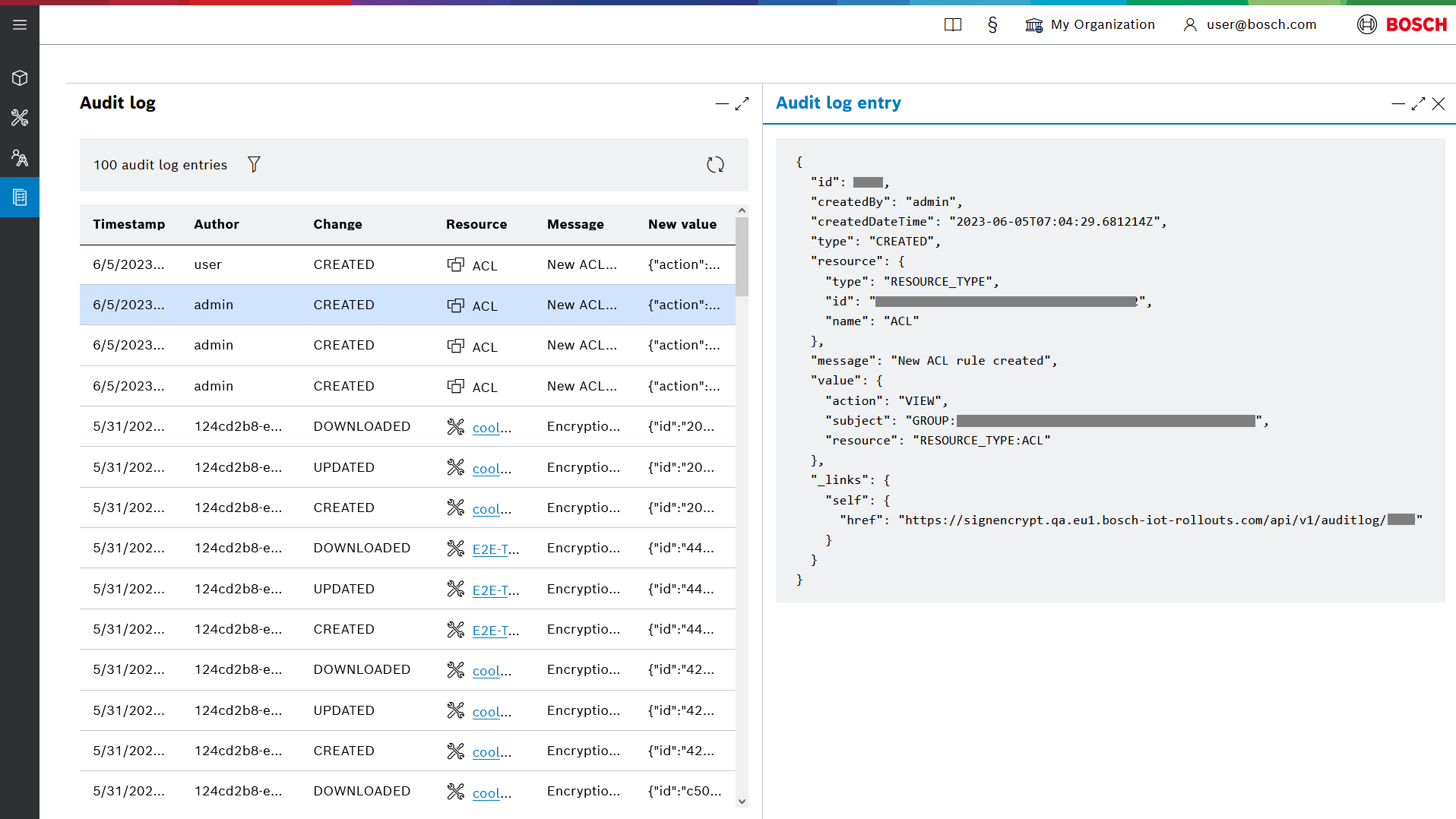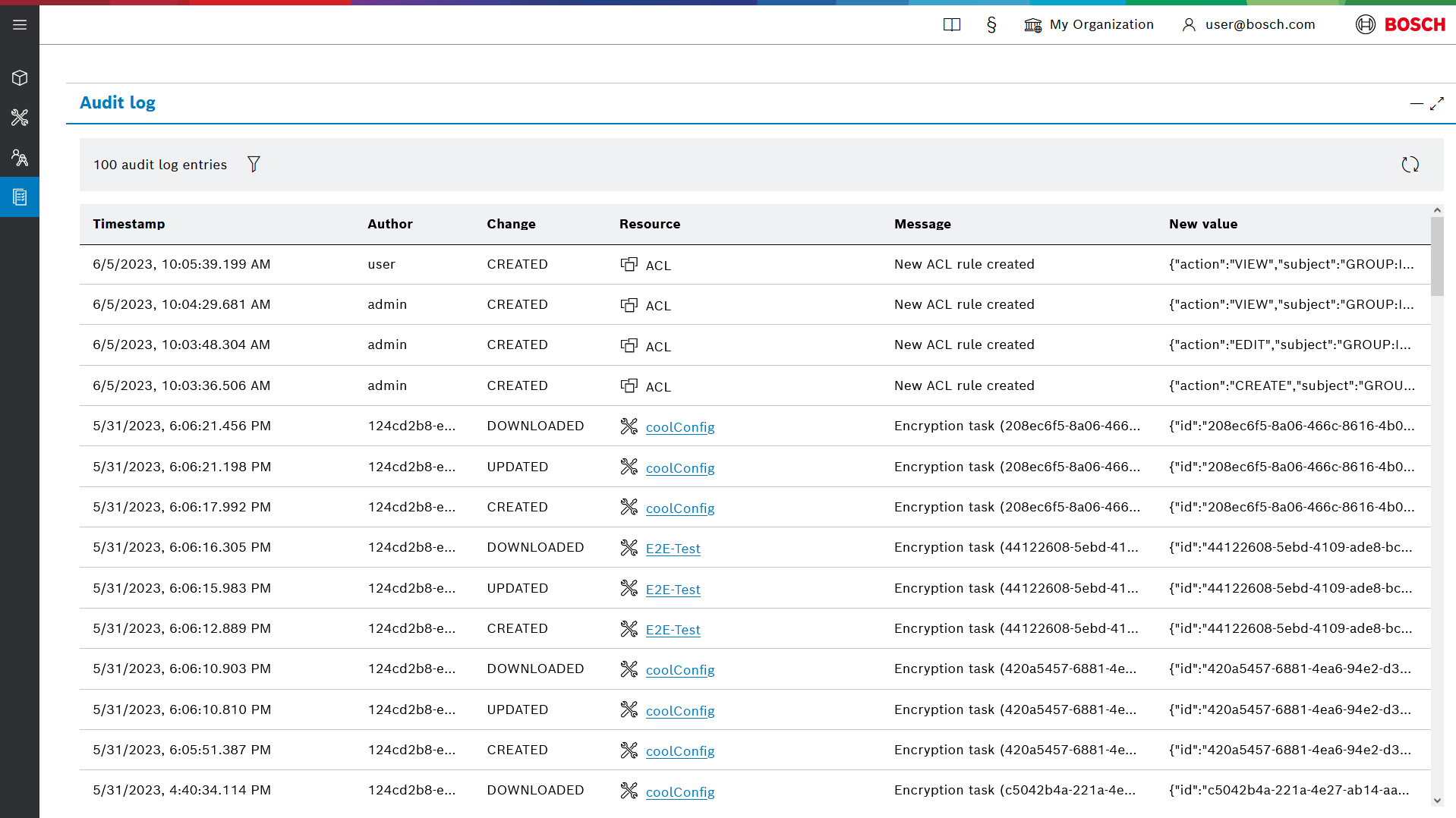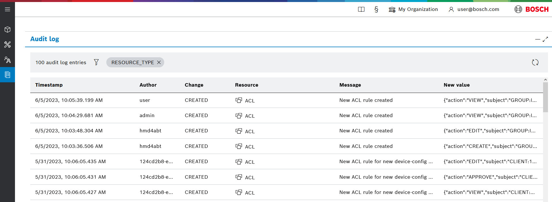 Once you enter the Audit log UI feature you will see a list of the last 100 audit log entries.