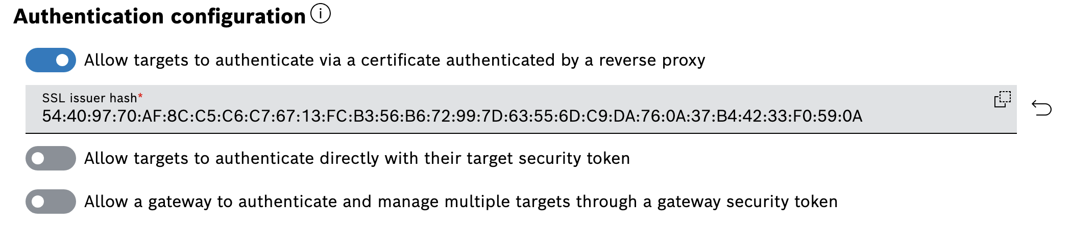 Note: You can enter multiple certificate fingerprints, separated by a semicolon. Bosch IoT Rollouts verifies that at least one of the provided fingerprints matches an incoming issuer hash header. This is useful for certificate migration.