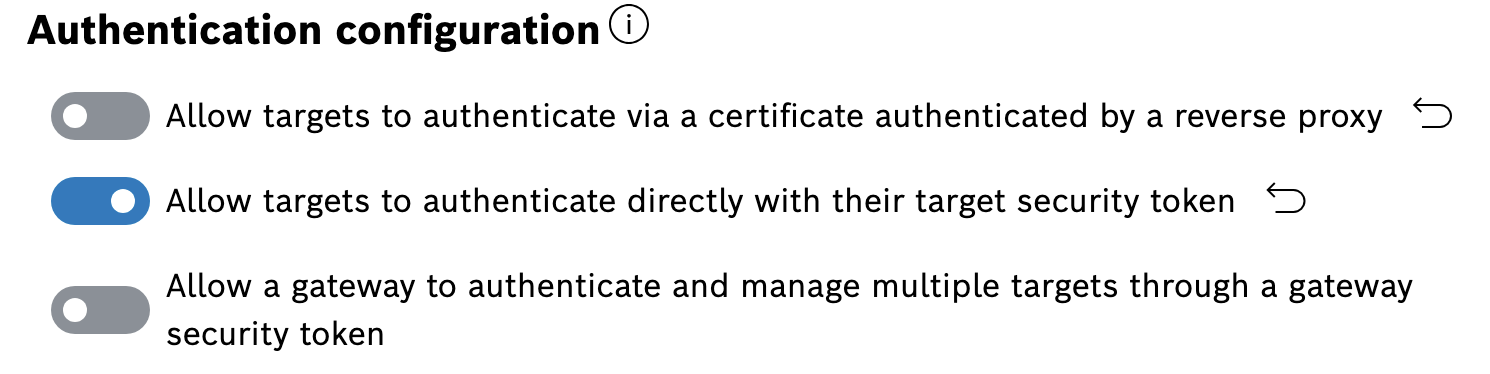 Bosch IoT Rollouts supports multiple ways to authenticate a target against the server. The different authentication modes can be enabled or disabled individually within Bosch IoT Rollouts.