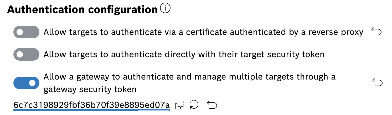 A 32-character alphanumeric security token is generated for each target created in Bosch IoT Rollouts. This token can be used to authenticate the target at Bosch IoT Rollouts via the HTTP Authorization header with the custom scheme TargetToken.