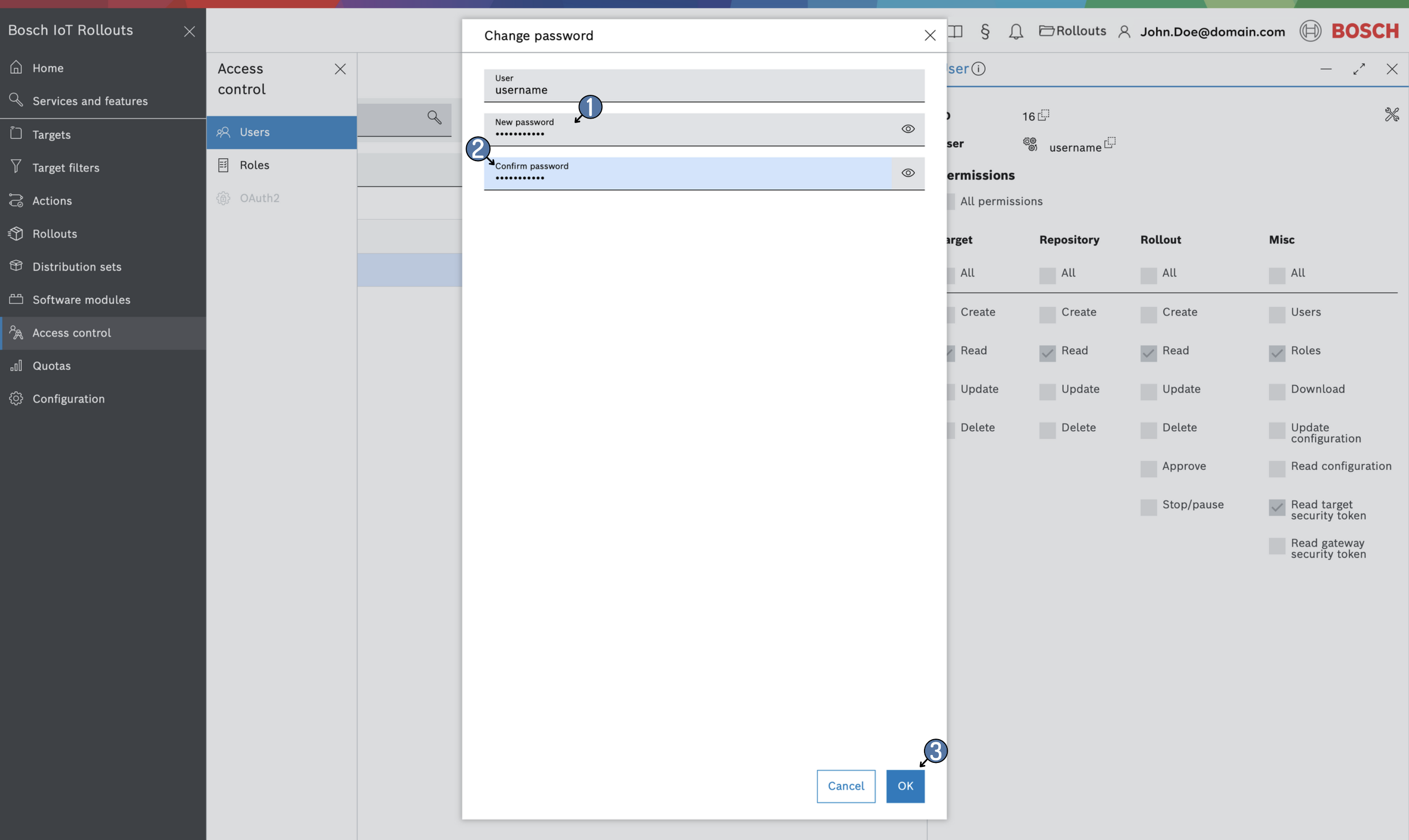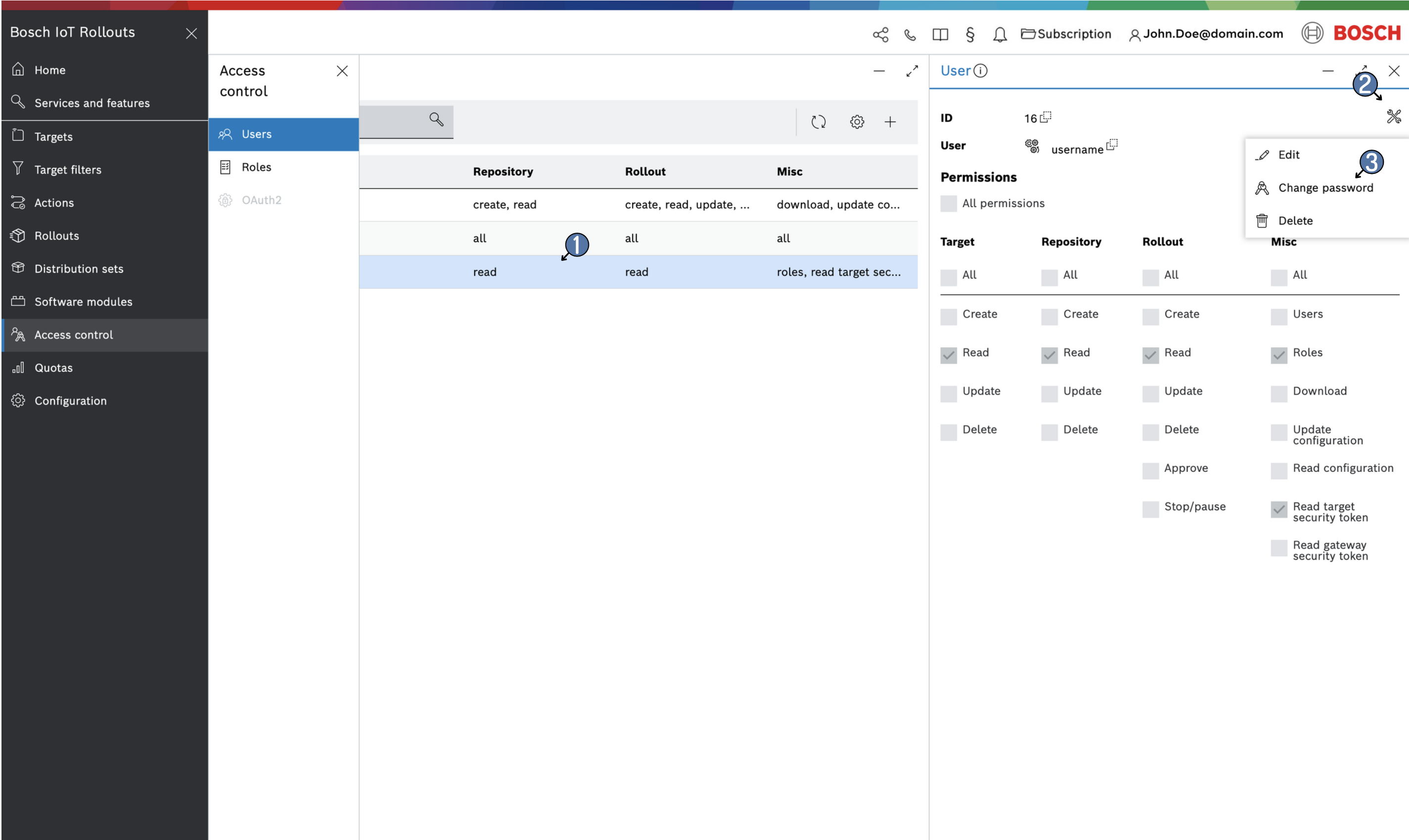 Select Access control from the left navigation and once in the Users select the technical user. Then, click the user actions icon in the top right area with user properties.