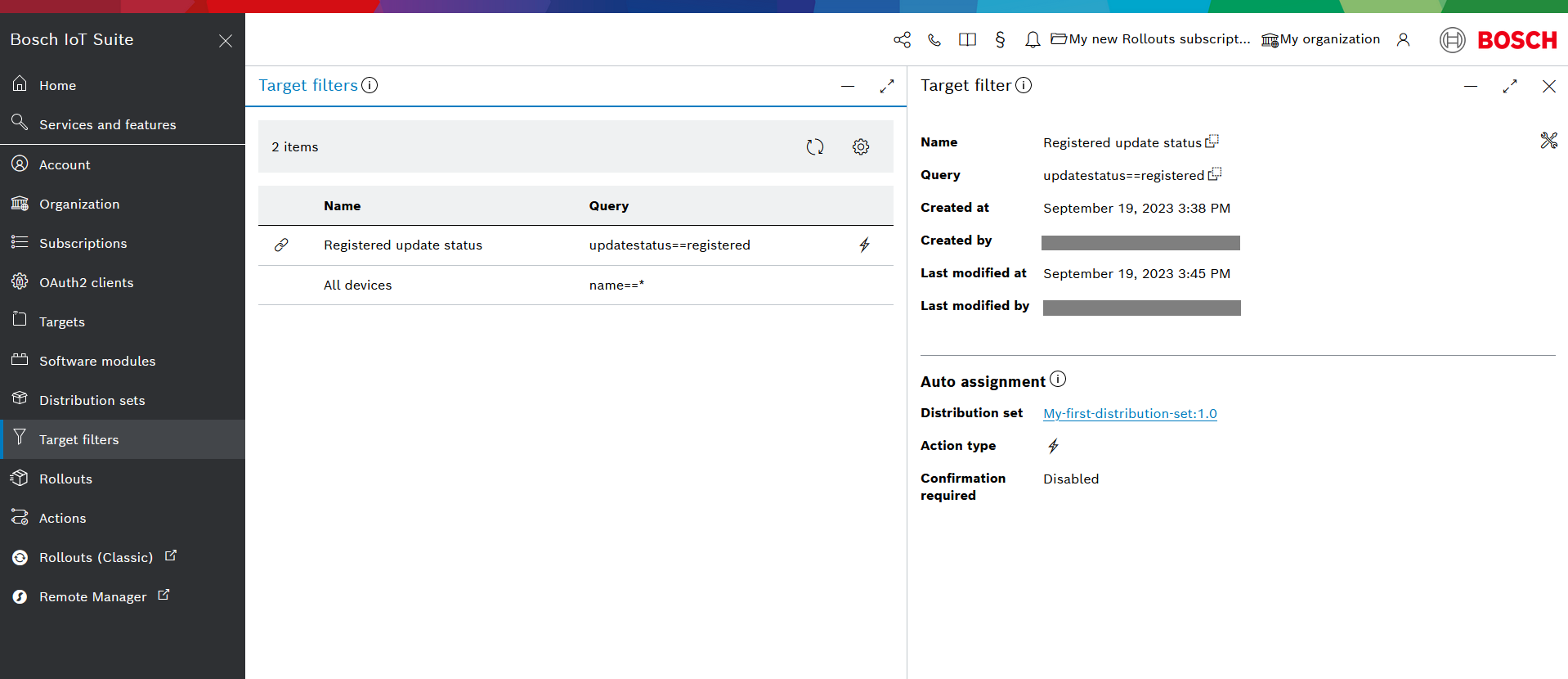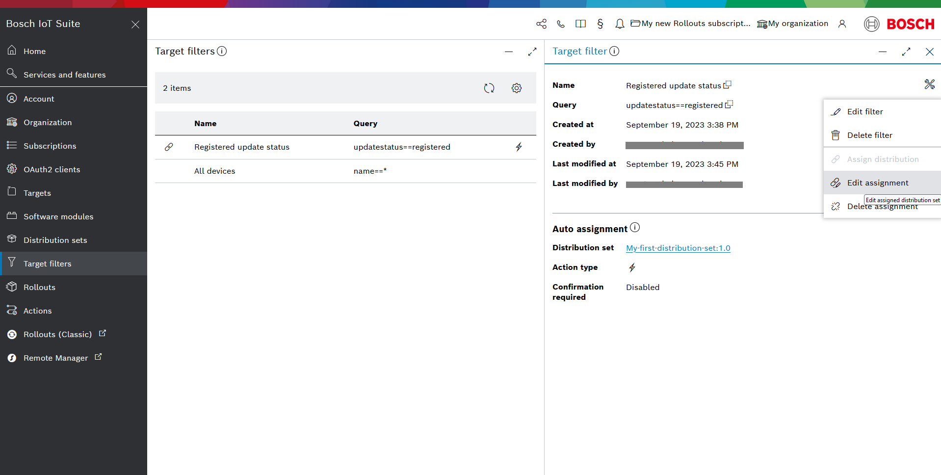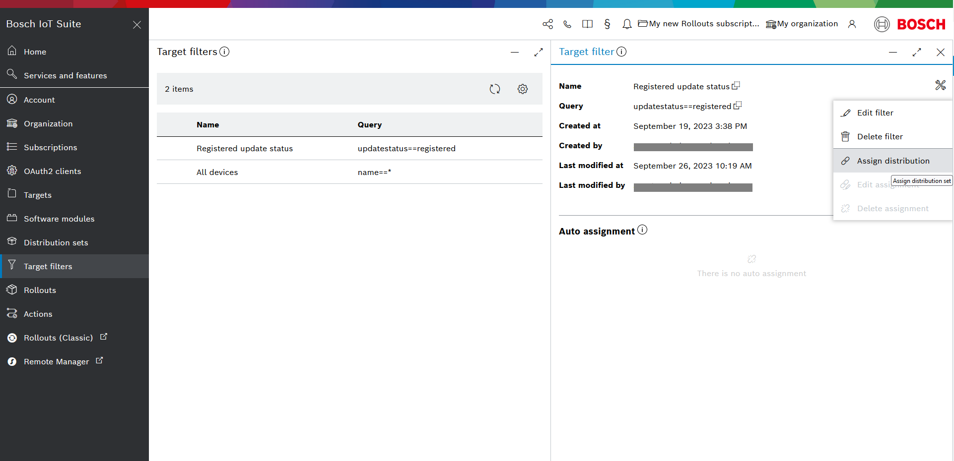 Upon that, the information about the newly created auto assignment will be displayed in the Auto assignment section of the respective Target filter's detailed view.