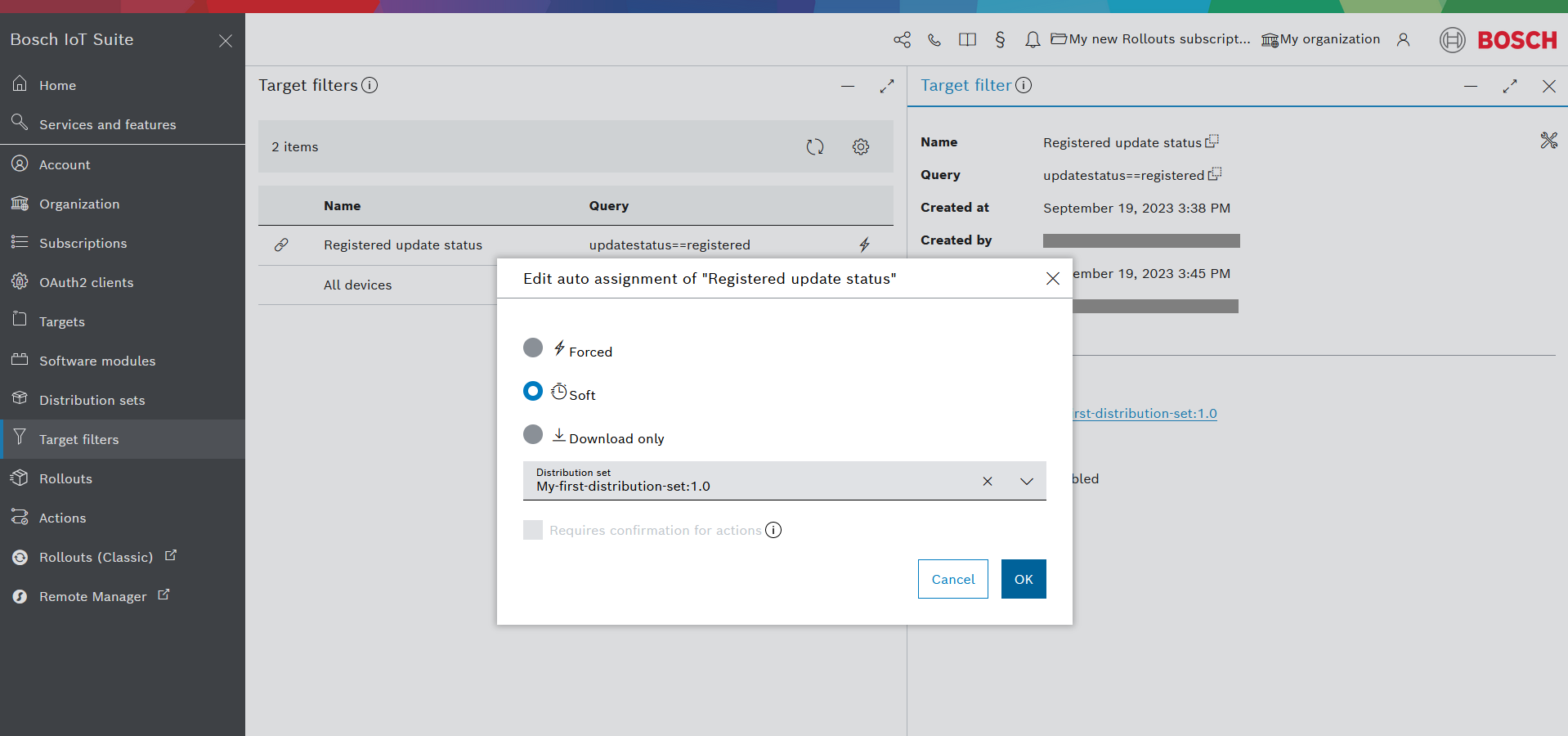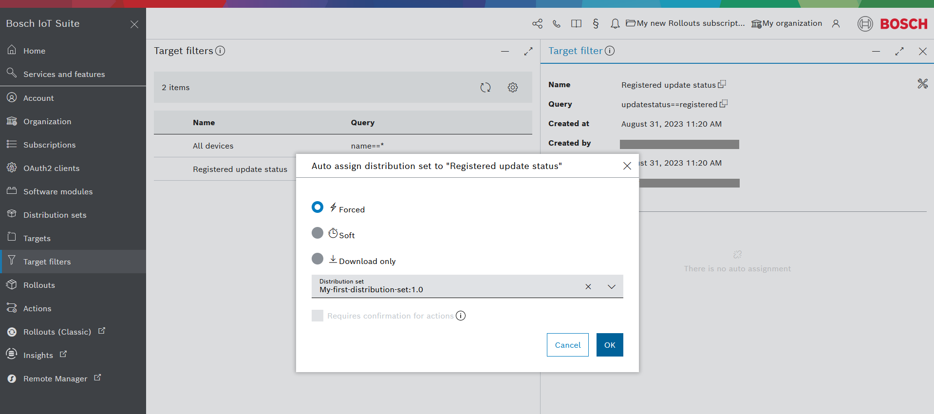 An auto assignment allows you to assign automatically a distribution set to a target filter, i.e. to all targets which match a specific target filter. Thus when new targets are provisioned in the future, they will also receive the assignment automatically, as long as they match the target filter.