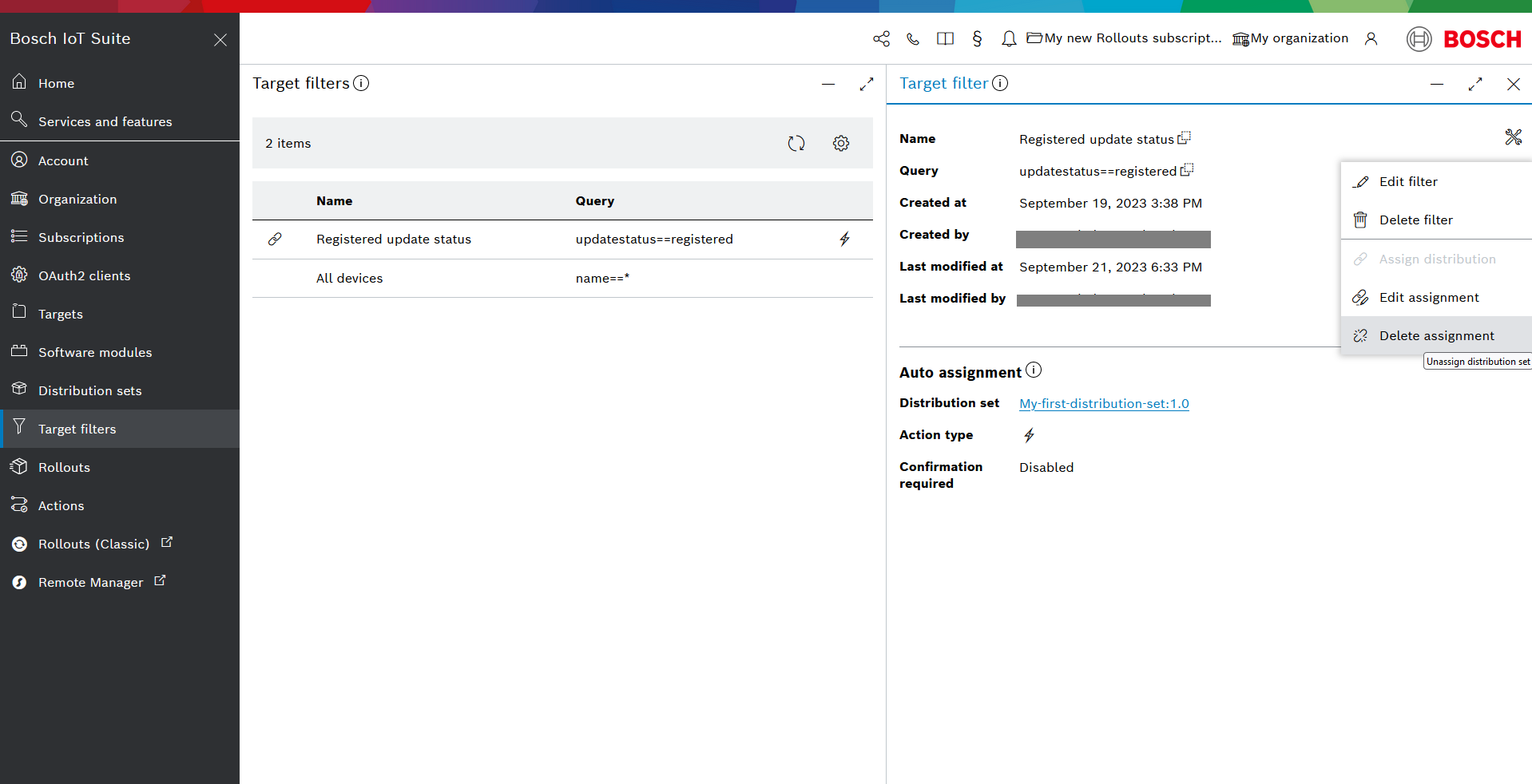 Deleting an auto assignment is possible through the Target filter actions menu.