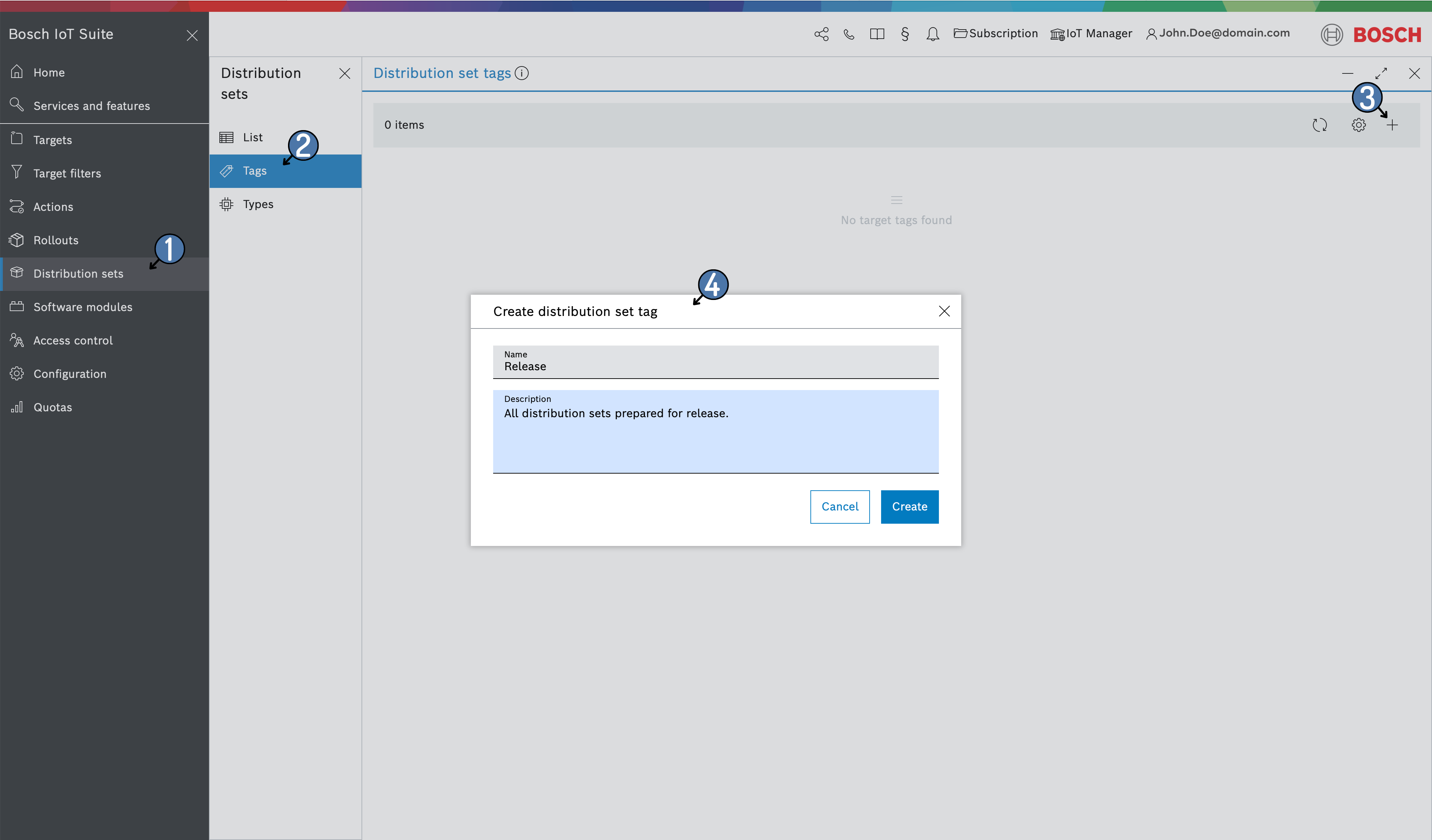 To create a tag, simply press the + button on the upper right corner of the tags list, add a name and description in the Create distribution set tag popup and click Create.