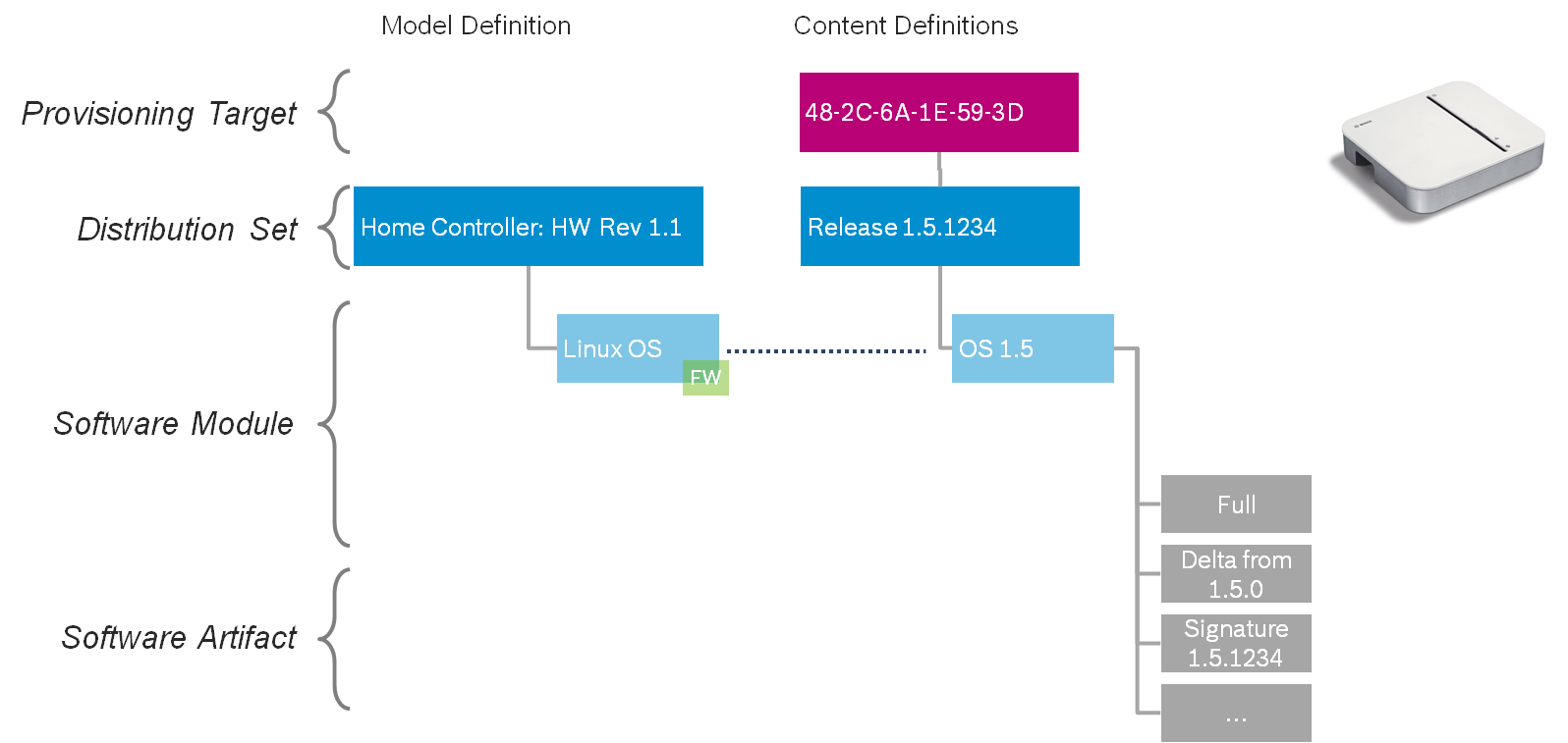 The data model of the Bosch IoT Rollouts update server has enough flexibility to define complex software structures, e.g. operating system, runtimes, apps, different kind of artifacts on one side and simplicity compared to the capabilities of a full blown configuration management.