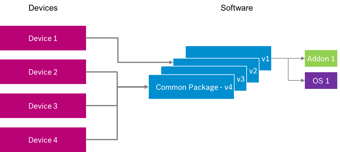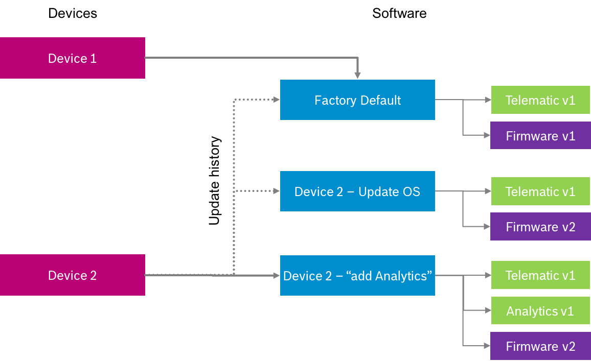 In this scenario, a distribution set is individual for a target at a certain point in time. This is typically true in store scenarios where devices get modules assigned or unassigned on an individual basis. Here with every module assignment change a new distribution set is created. As a result, the meaning of the distribution set changes from a “unified package” to a device specific setup.