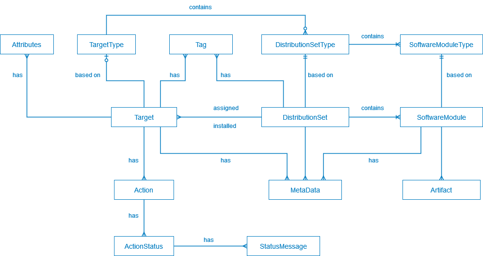 A Target can have, next to its defined properties (e.g. controller ID, target type, name, description, security token), a generic set of attributes and meta data, both in key:value format. Target attributes are owned and managed by the device whereas target meta data are managed by the operator. If a target is defined to be of a certain target type, then during the assignment of a distribution set, a compatibility check will be performed between the target type and distribution set type.