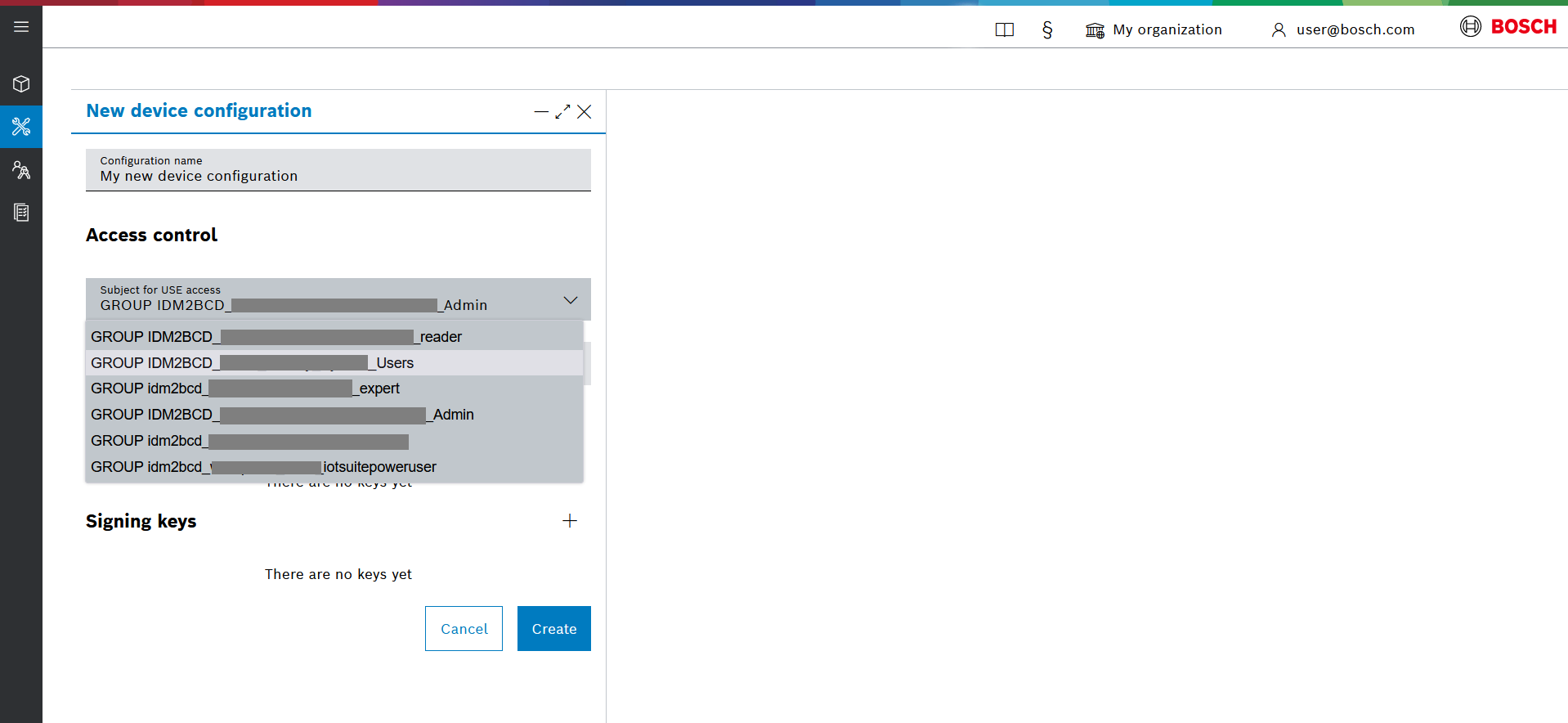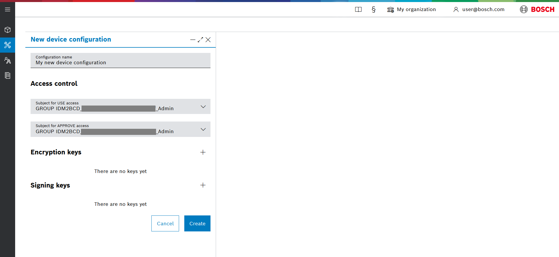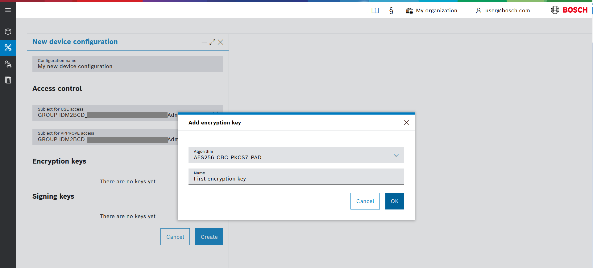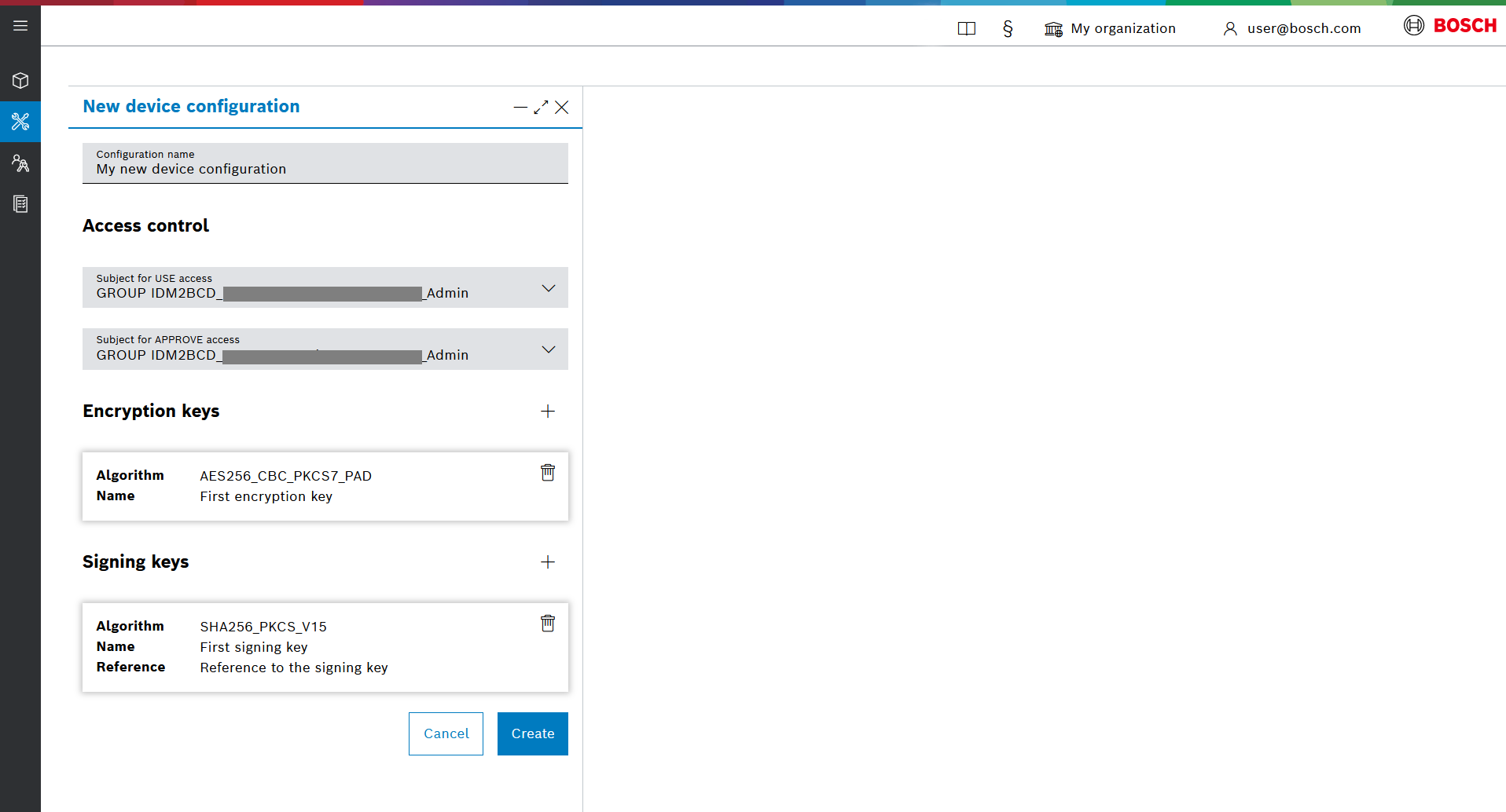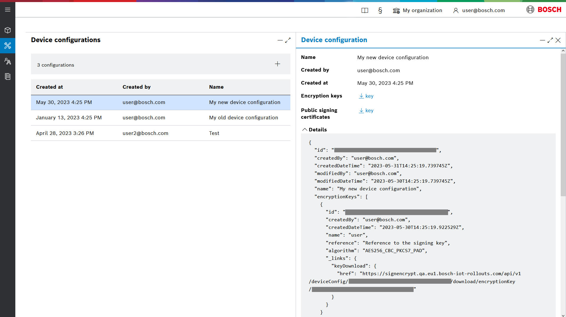 The Device configurations UI feature allows you to view and create device configurations, to see their details and download the encryption and public signing certificates assigned to them.