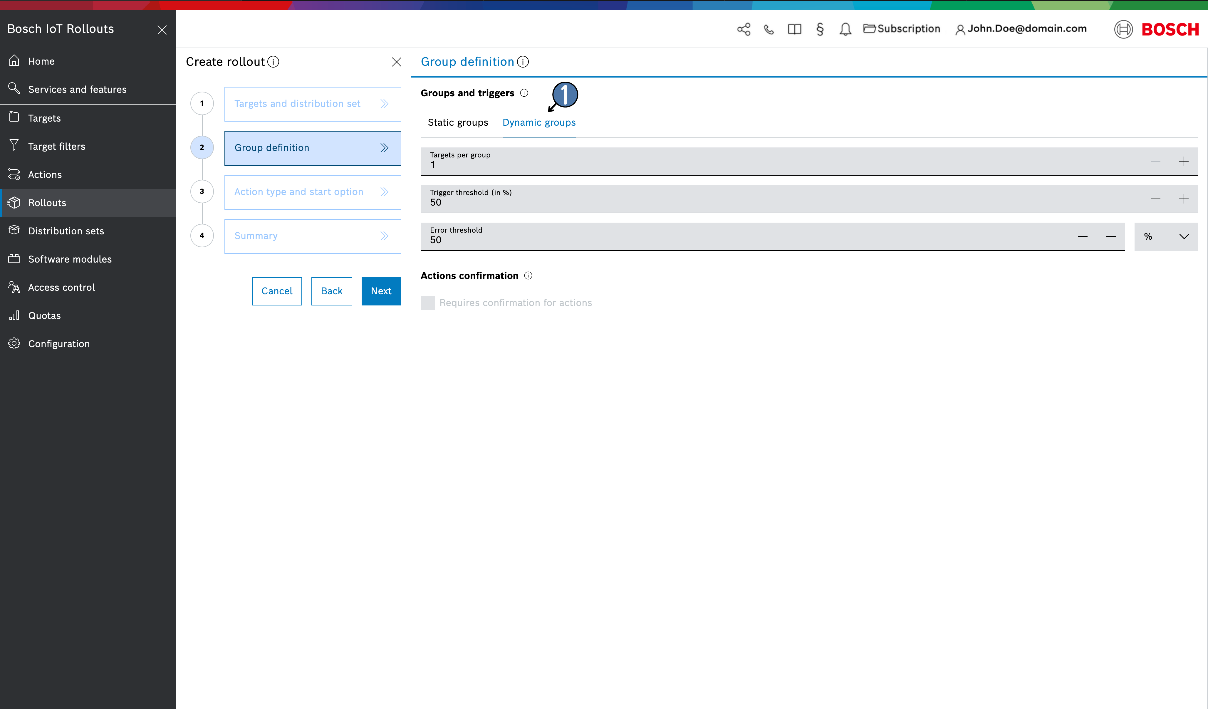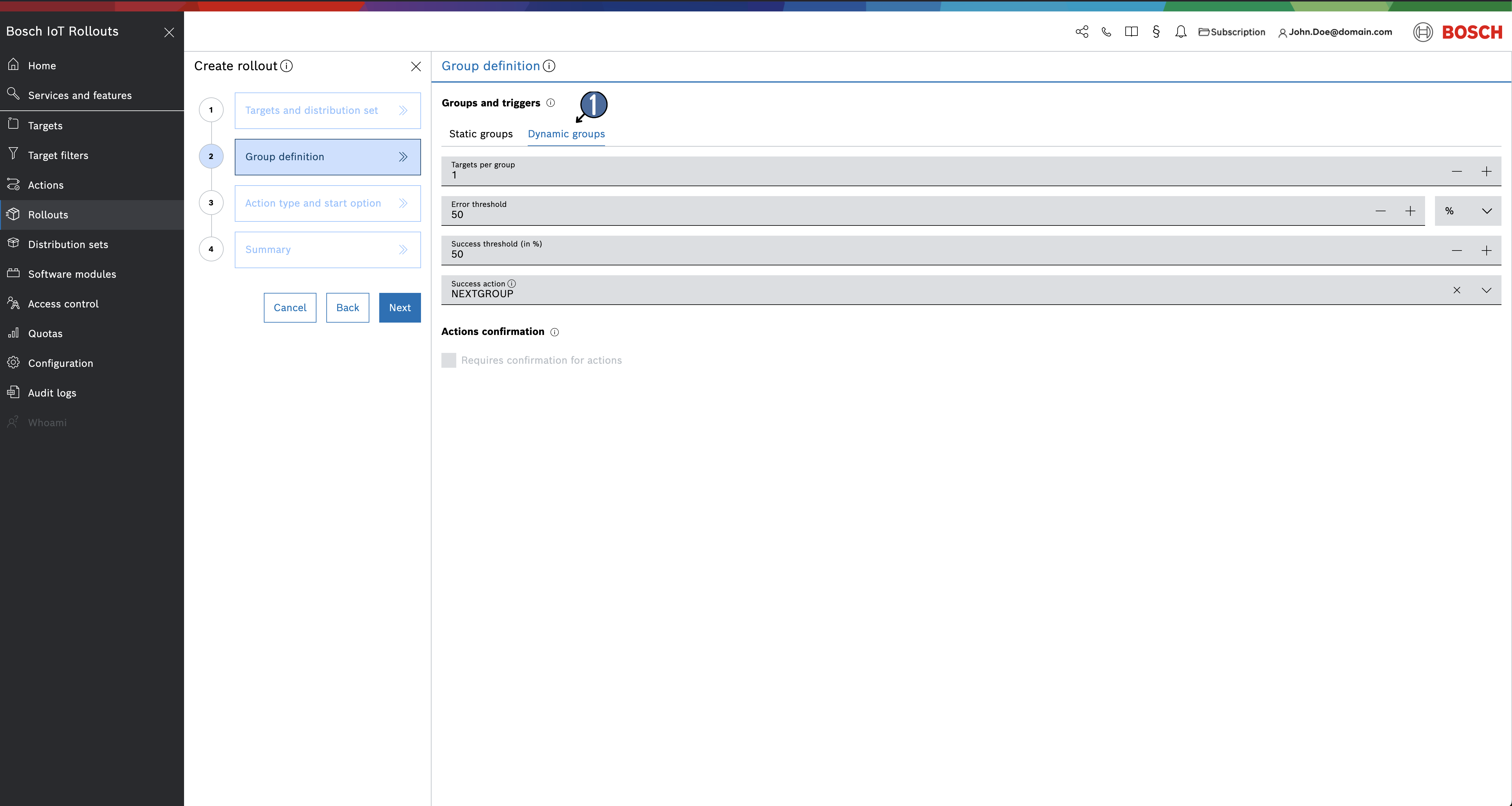 - Error threshold - the allowable failure rate (percentage or absolute number of targets) in a group before the entire rollout is emergency-stopped (also works as in static groups)