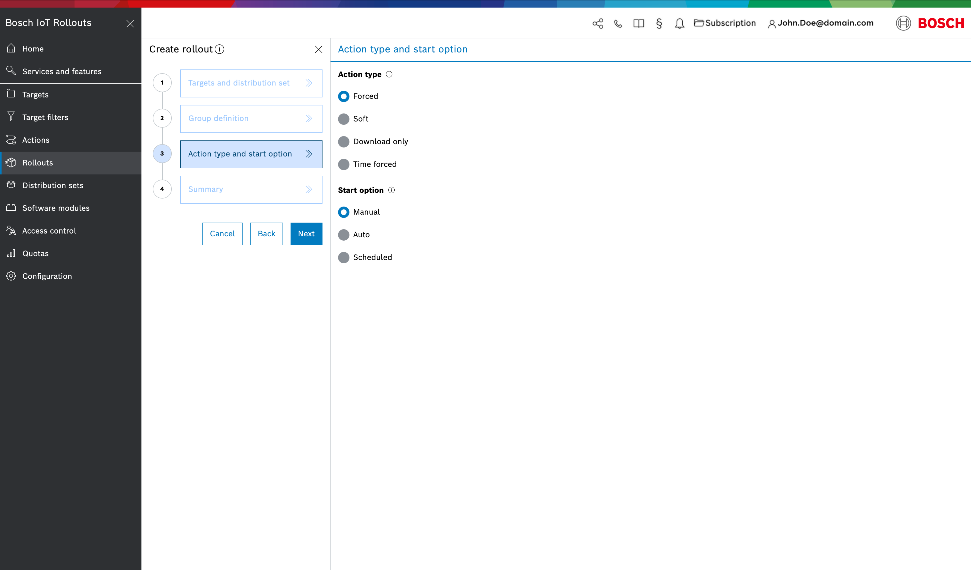 Manual – the rollout will wait for a manual start trigger by a user.