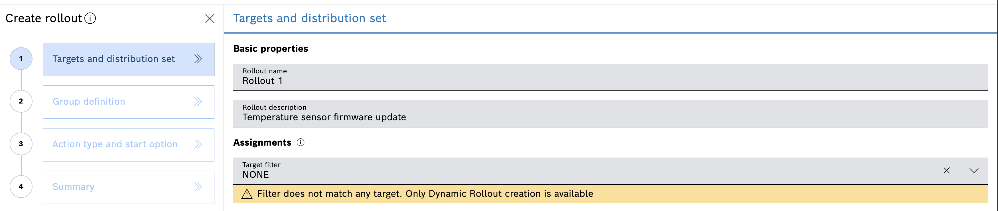 - Rollout 1: Target filter – installedds.name == "<Distribution set name>" and installedds.version == 1.0.0.