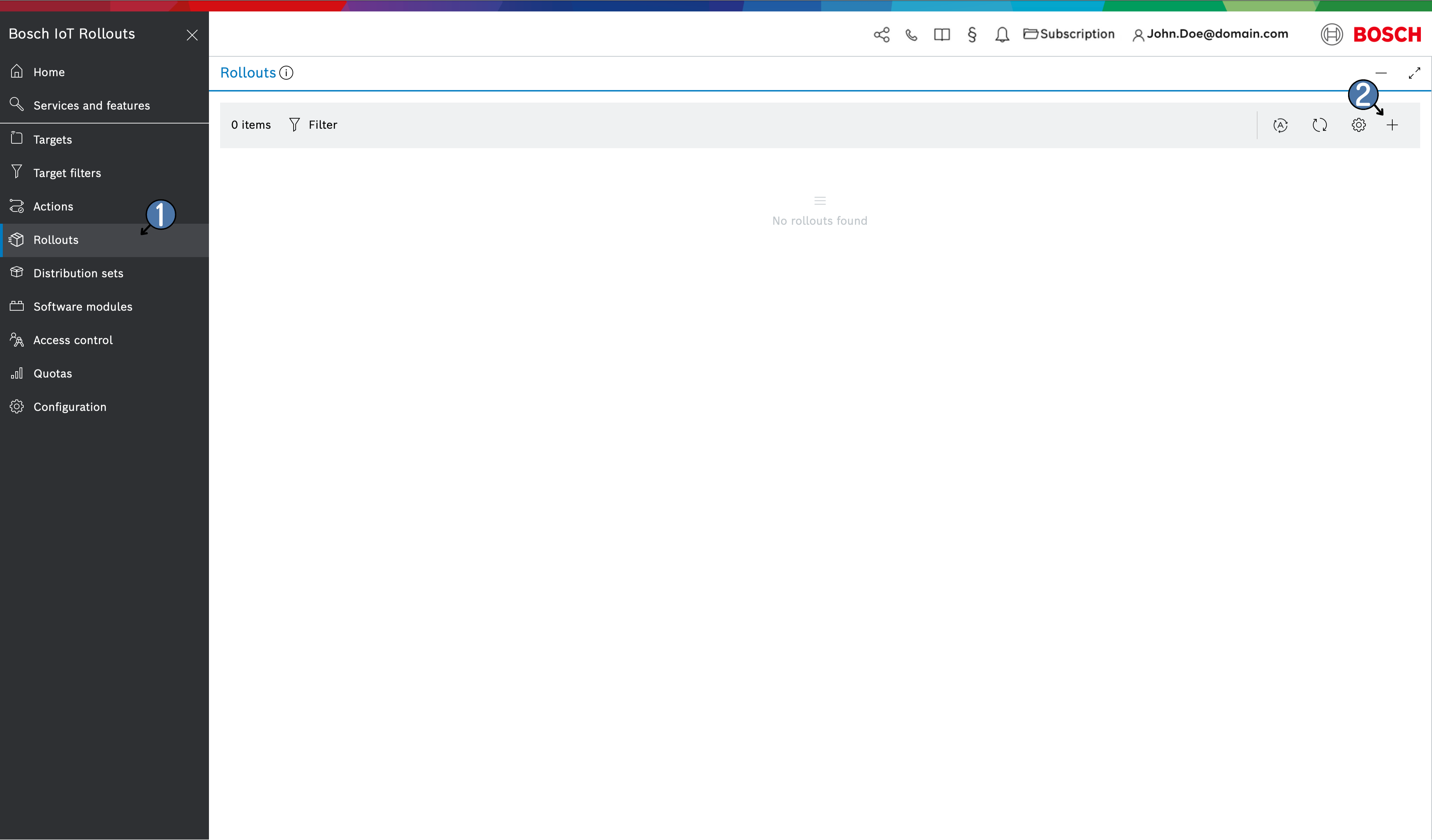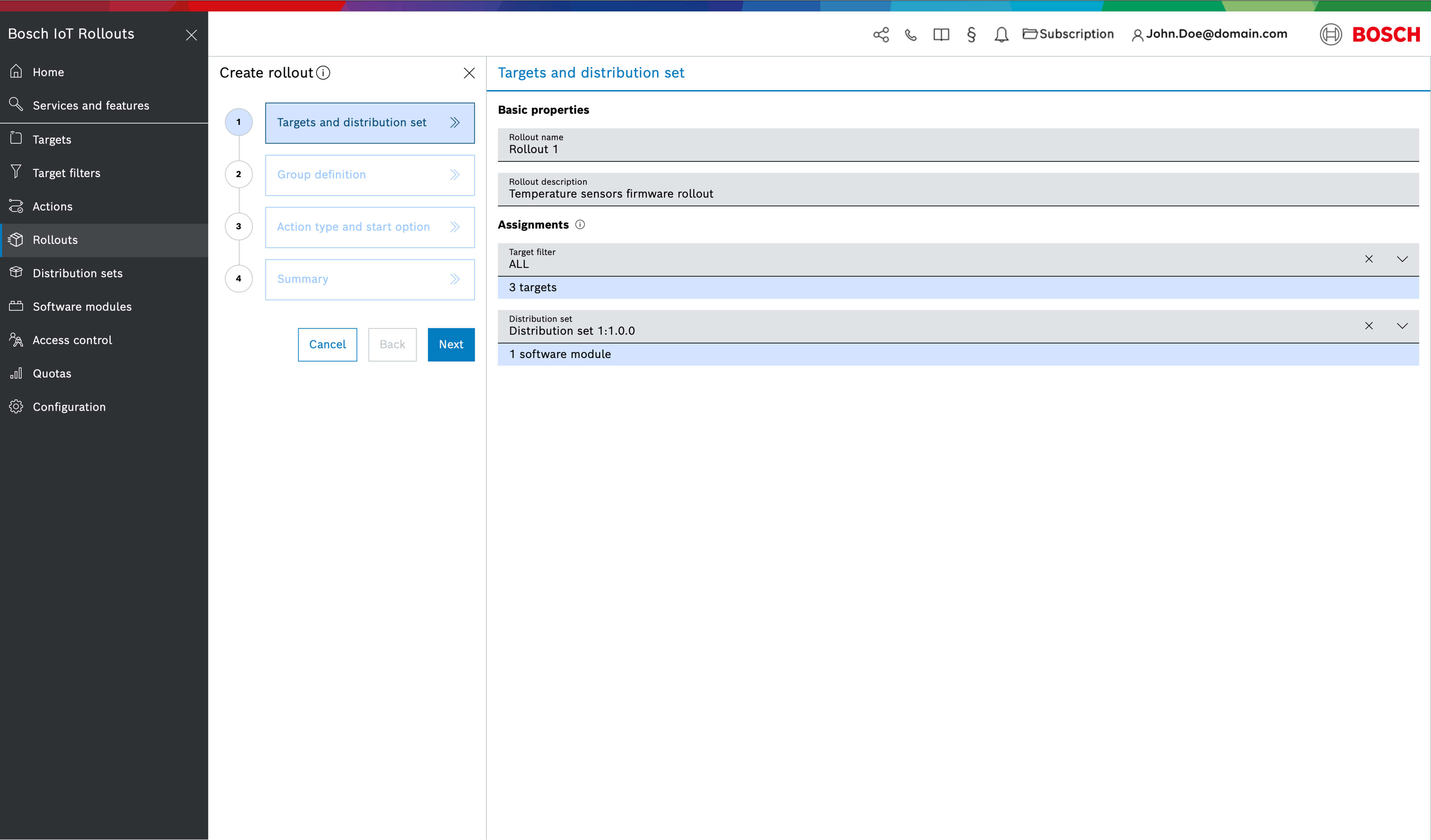 Open Rollouts from the left navigation and click the + icon in the header to start creating a new rollout . This launches the Create Rollout wizard with a series of steps: