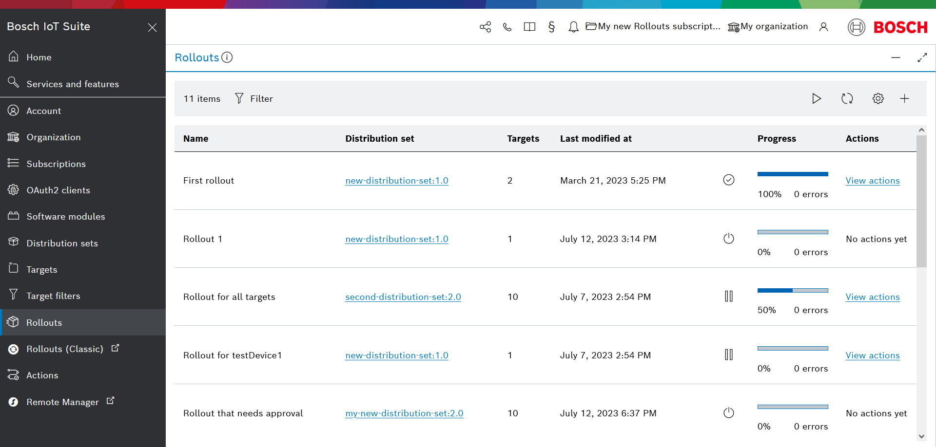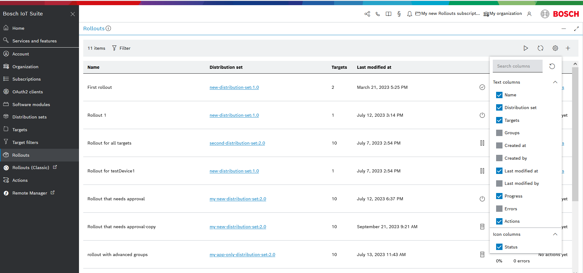 You can manage the rollout groups list view in the same way as described above at Configure list columns and Refresh and auto-refresh the list.