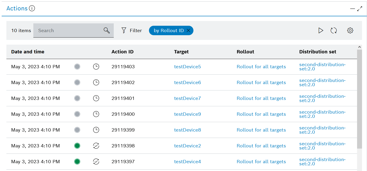 Actions - a quick link to a list of all actions requested on the targets by the respective rollout