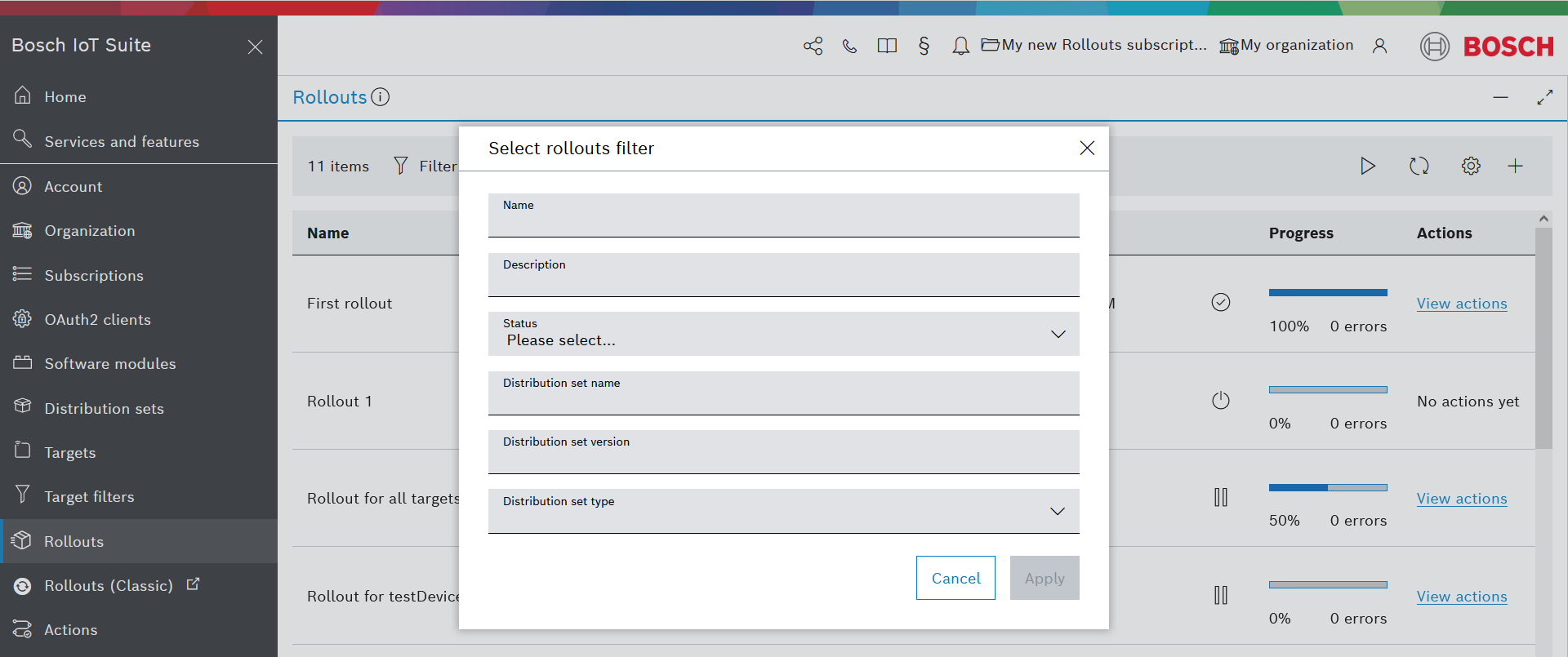To find the relevant rollouts more easily, you can filter the list according to various criteria through the filter icon on top of the list.
