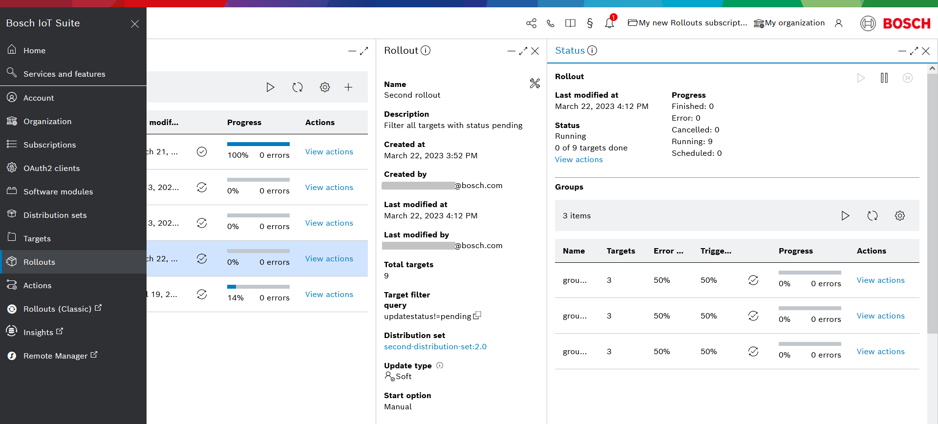 - Last modified at - the date and time when the rollout was last modified, i.e. manually paused, resumed, or canceled
