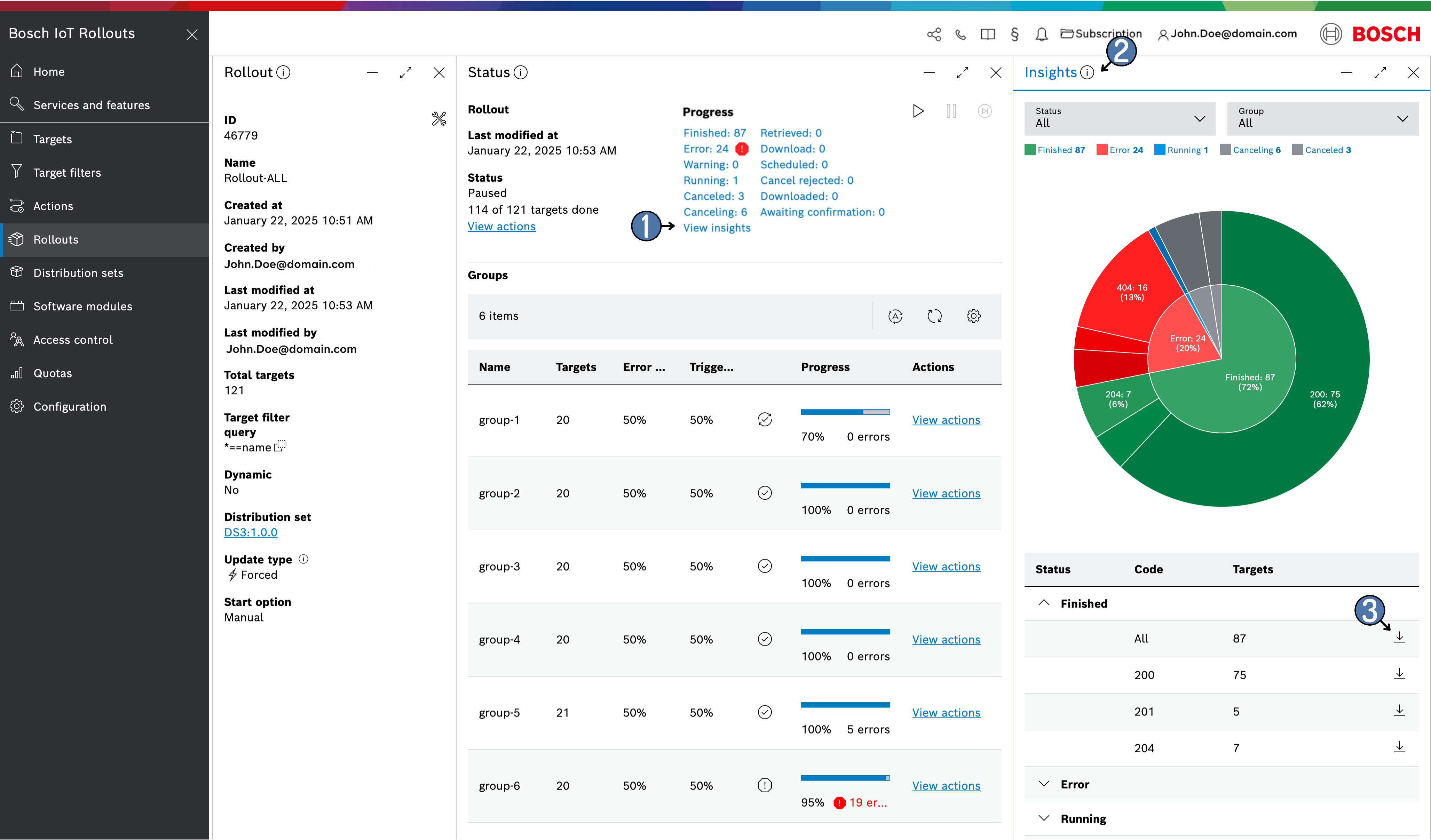 - Click on any status value (e.g., "Finished: 87," "Error: 24") or the View insights link to open the Rollout Insights blade on the right side of the UI (marked as 2 in the screenshot). Selecting a specific status will pre-apply the status filter.