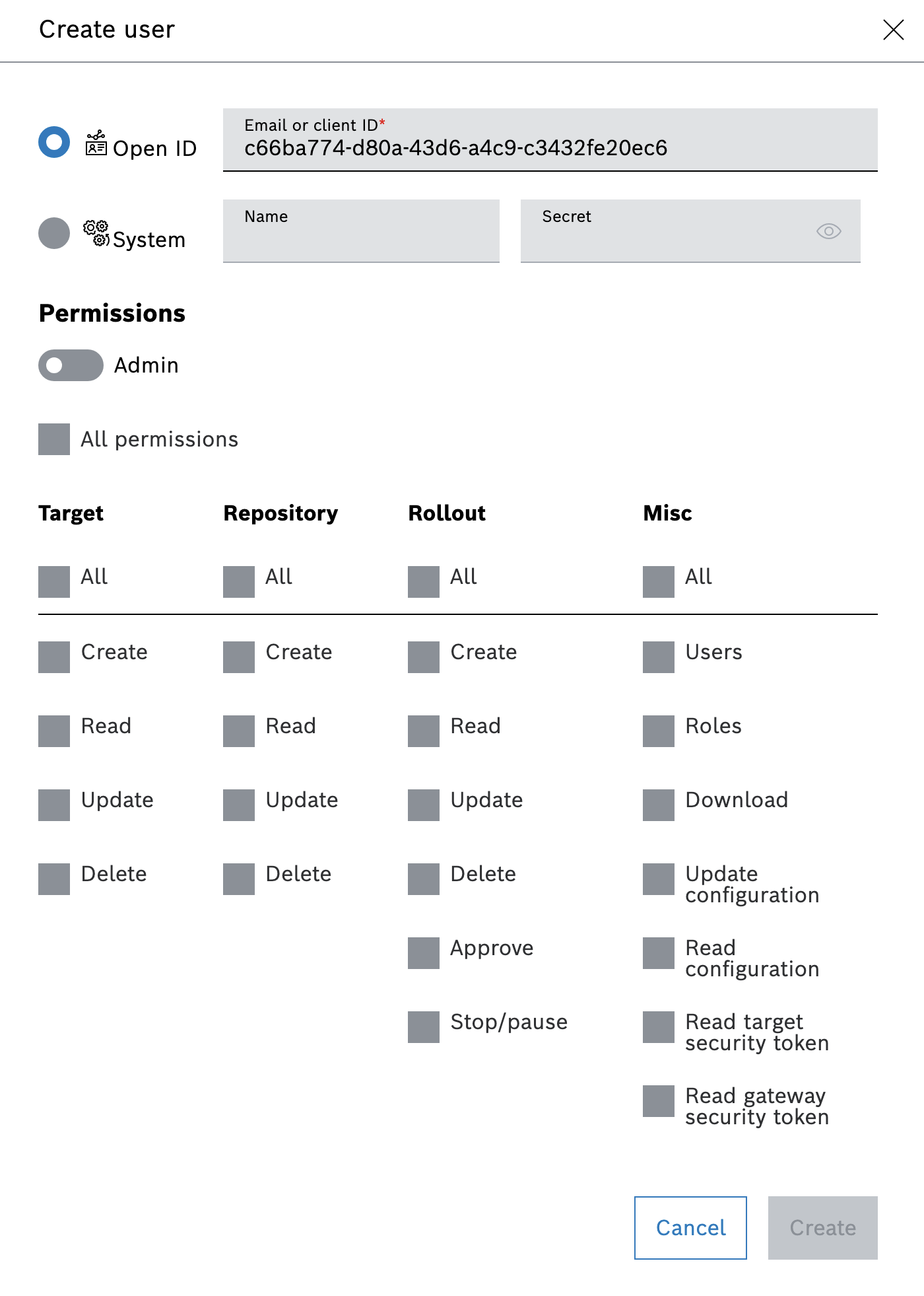 OpenIDType and set the client ID as the username. - Assign the appropriate permissions to this user following the procedure outlined in Add New User.