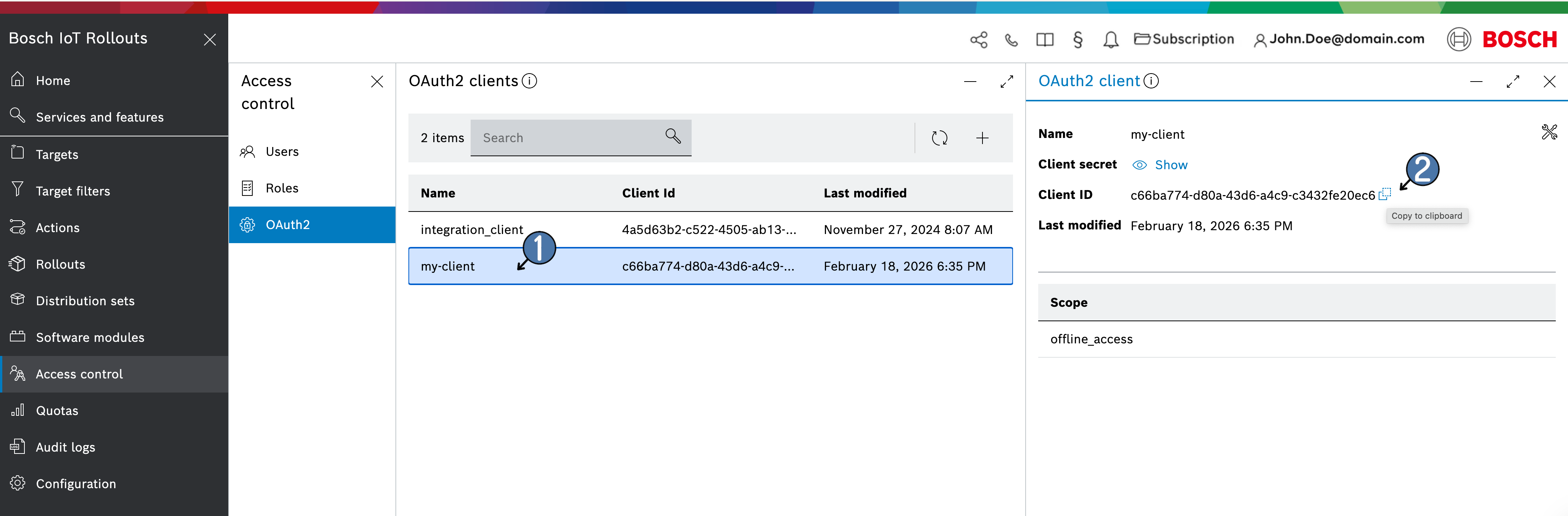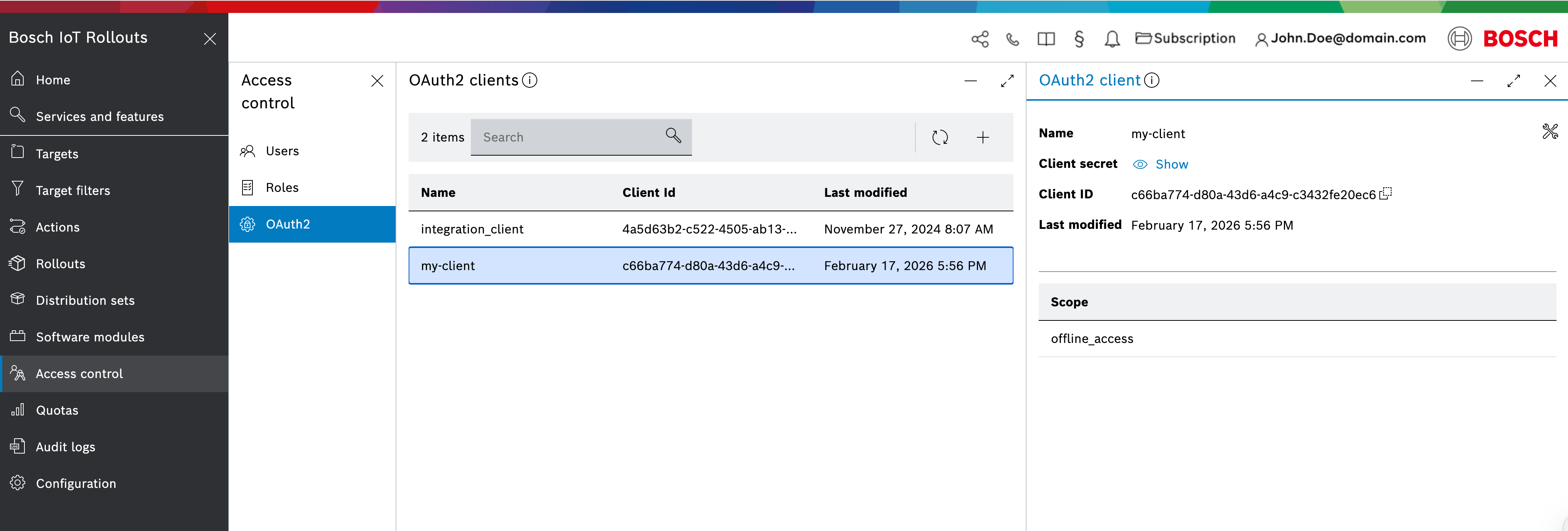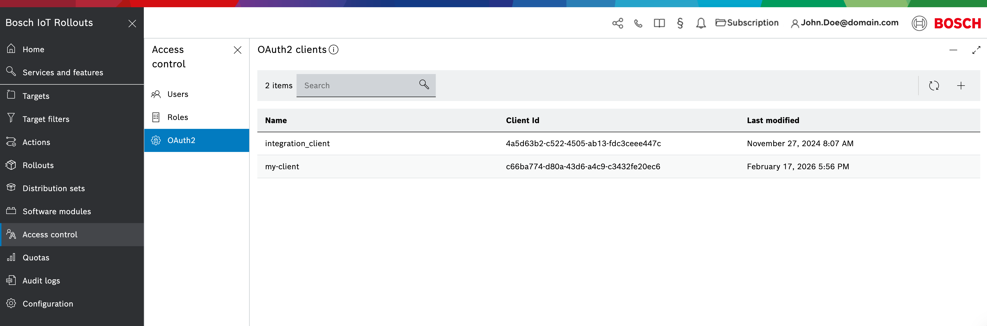 By following the industry-standard protocol for authorization, a client can obtain an access token via Client Credentials Grant flow and authenticate your application when calling the Bosch IoT Rollouts APIs.
