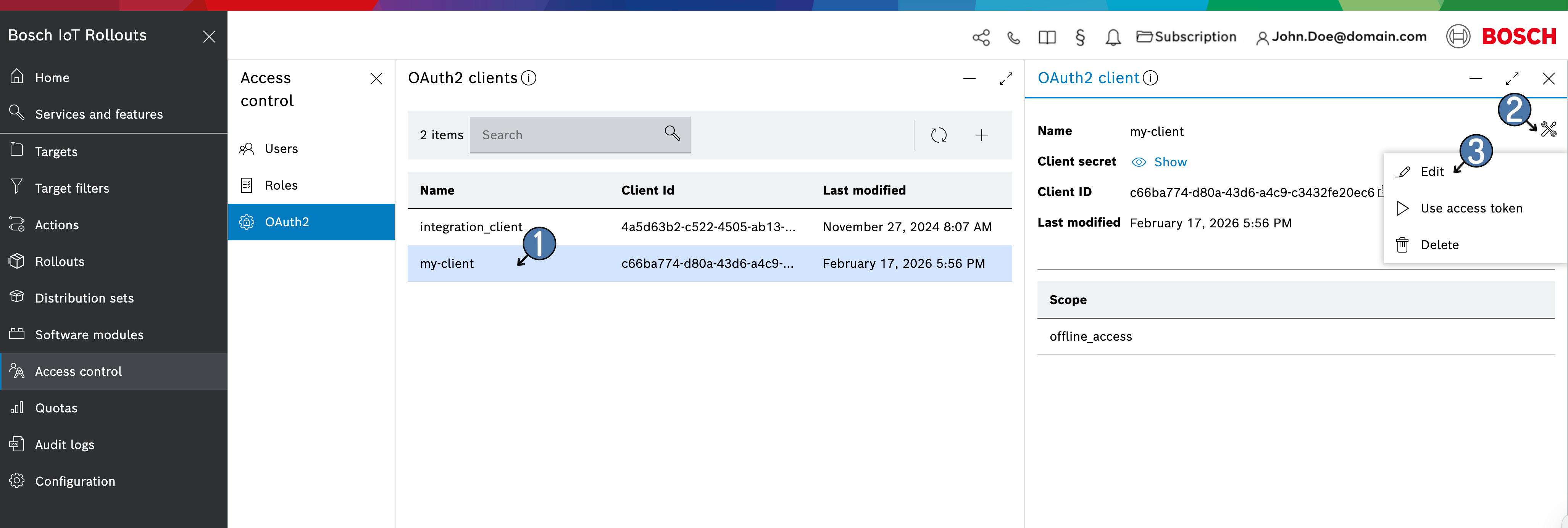 - Click the OAuth2 client actions icon in the top right area of the OAuth2 client details