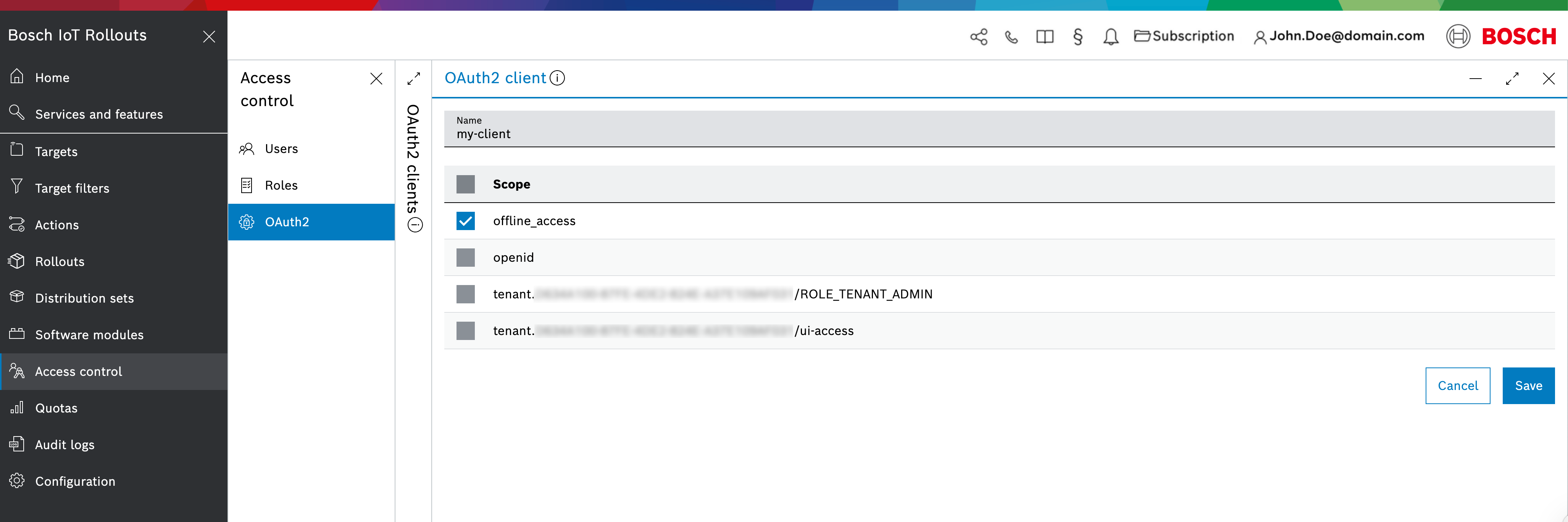 - Use the obtained access token to access the Bosch IoT Rollouts Service API (via cURL, Spring)