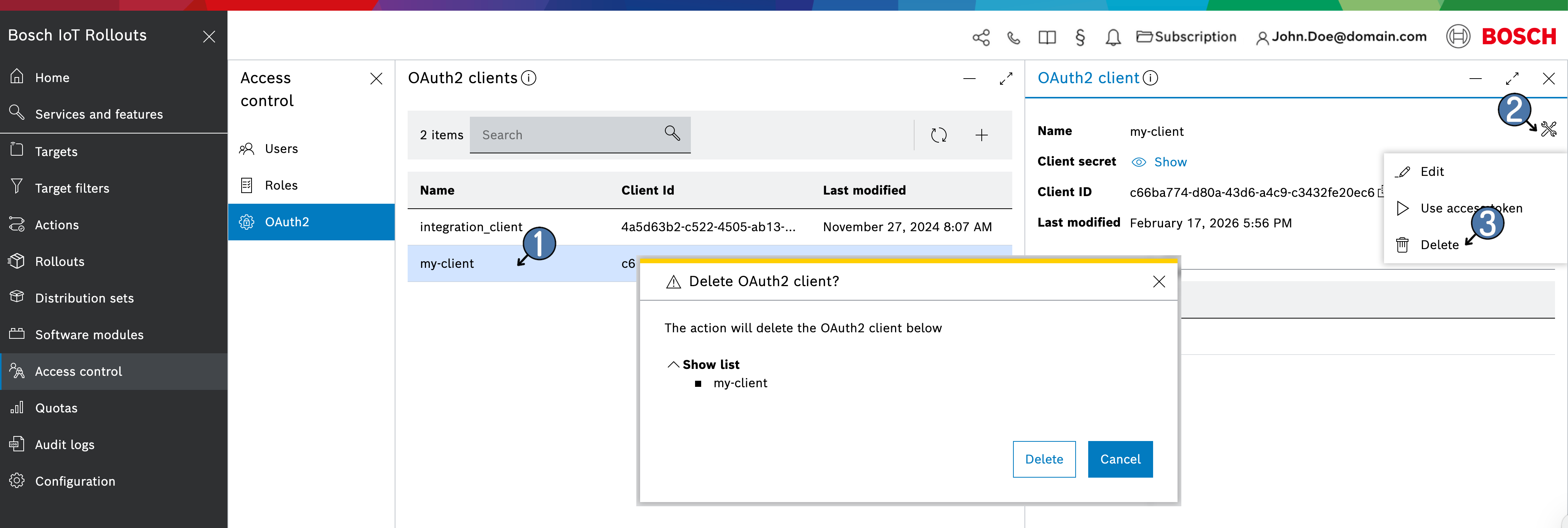 - Click the Delete button on the Delete OAuth2 client confirmation dialog
