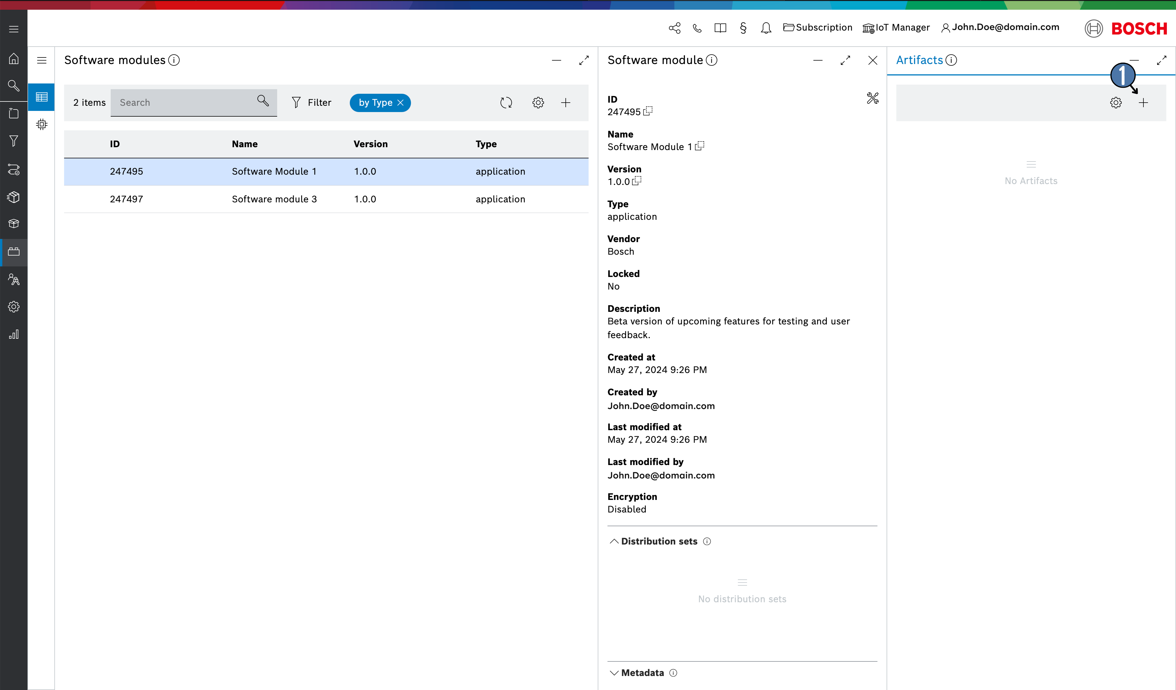 To upload an artifact to a selected software module click the + icon in the Artifacts blade view (on the right of the Software module blade view) and select one or more artifacts that you want to upload from your file system.