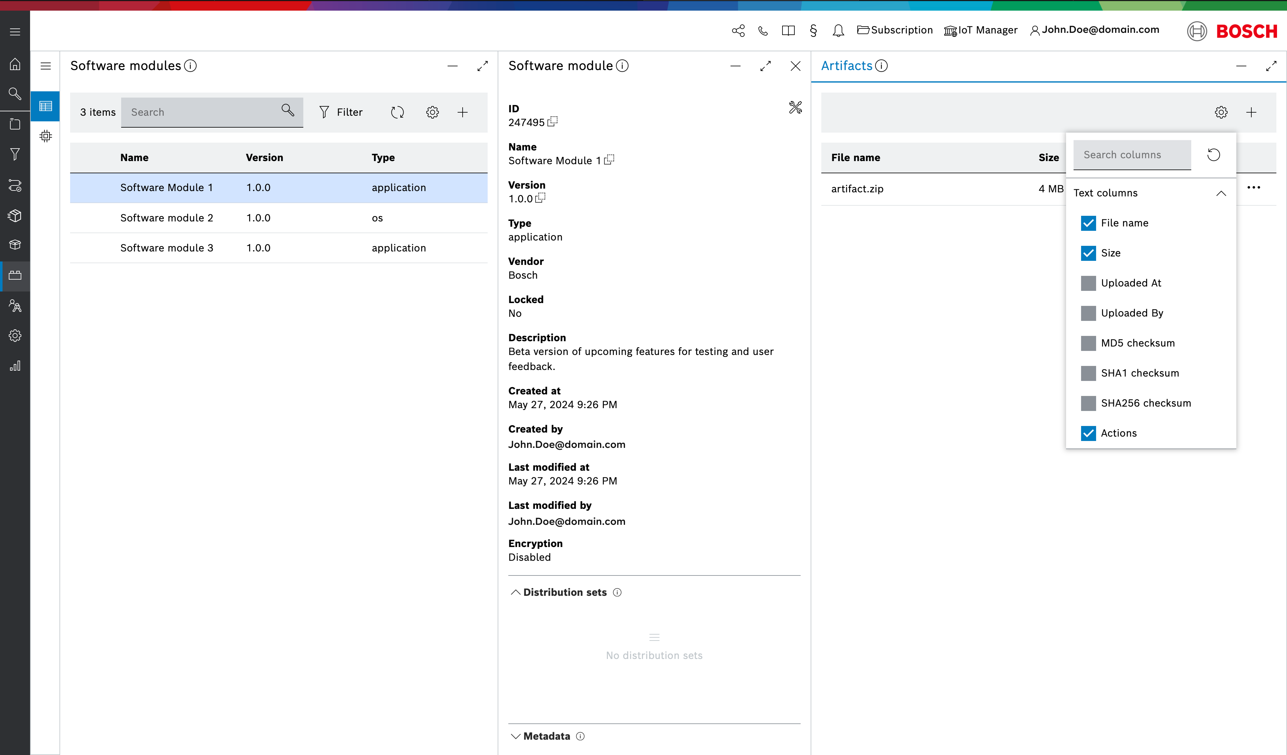 The Artifacts view allows you to manage them. Click the Actions icon on a concrete artifact and use the respective buttons to:
