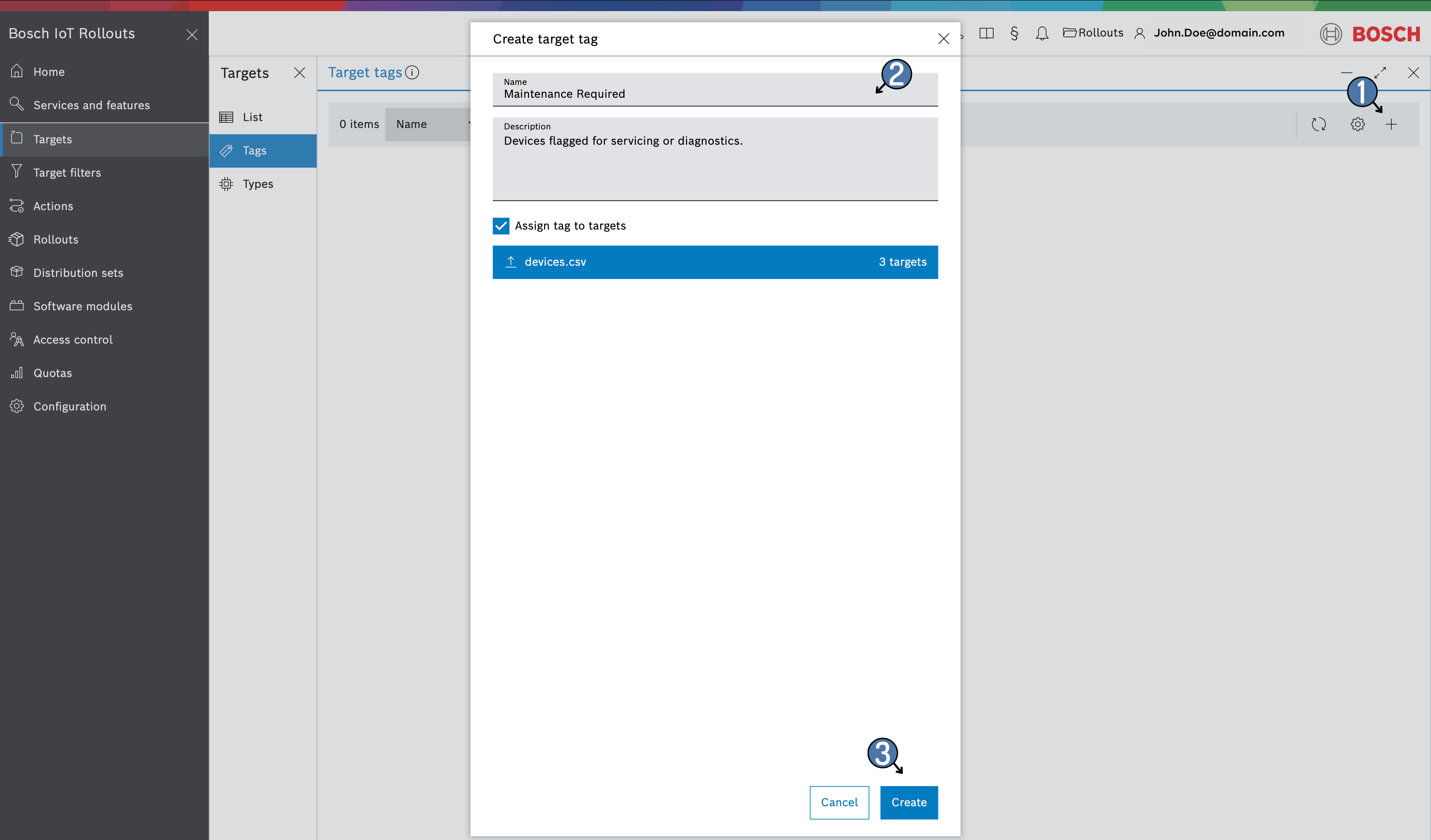 - Create Rollout with tagged targets - prompts you with the Rollout creation wizard with a pre-applied target filter matching the targets with the particular tag assigned.