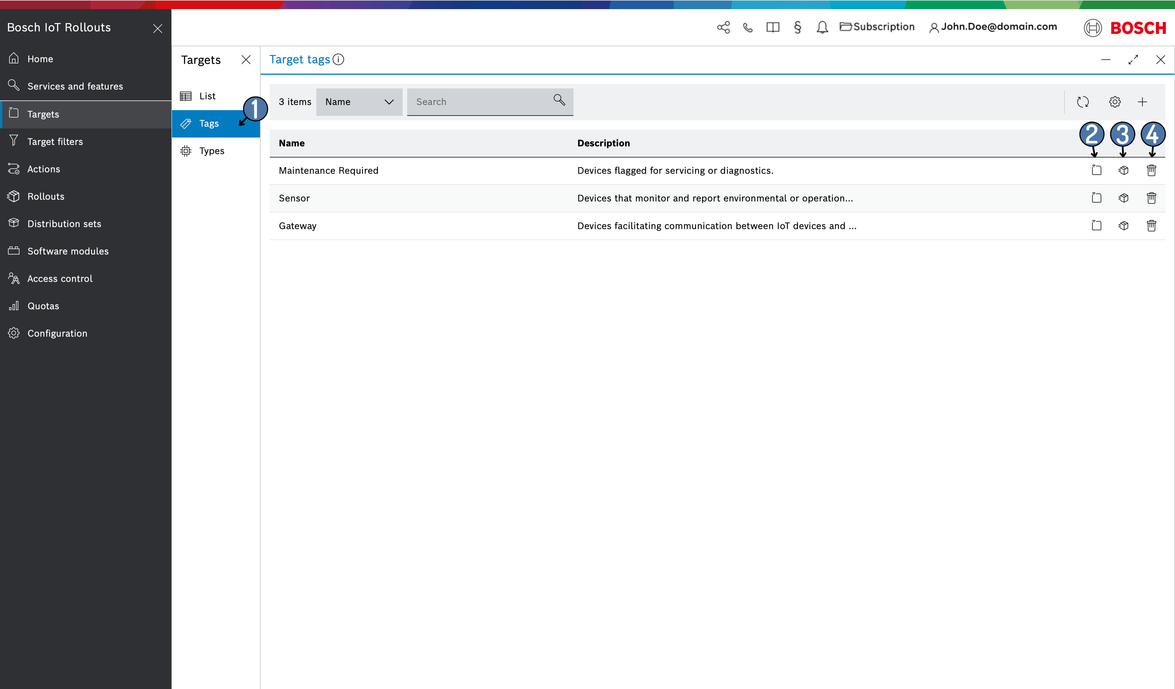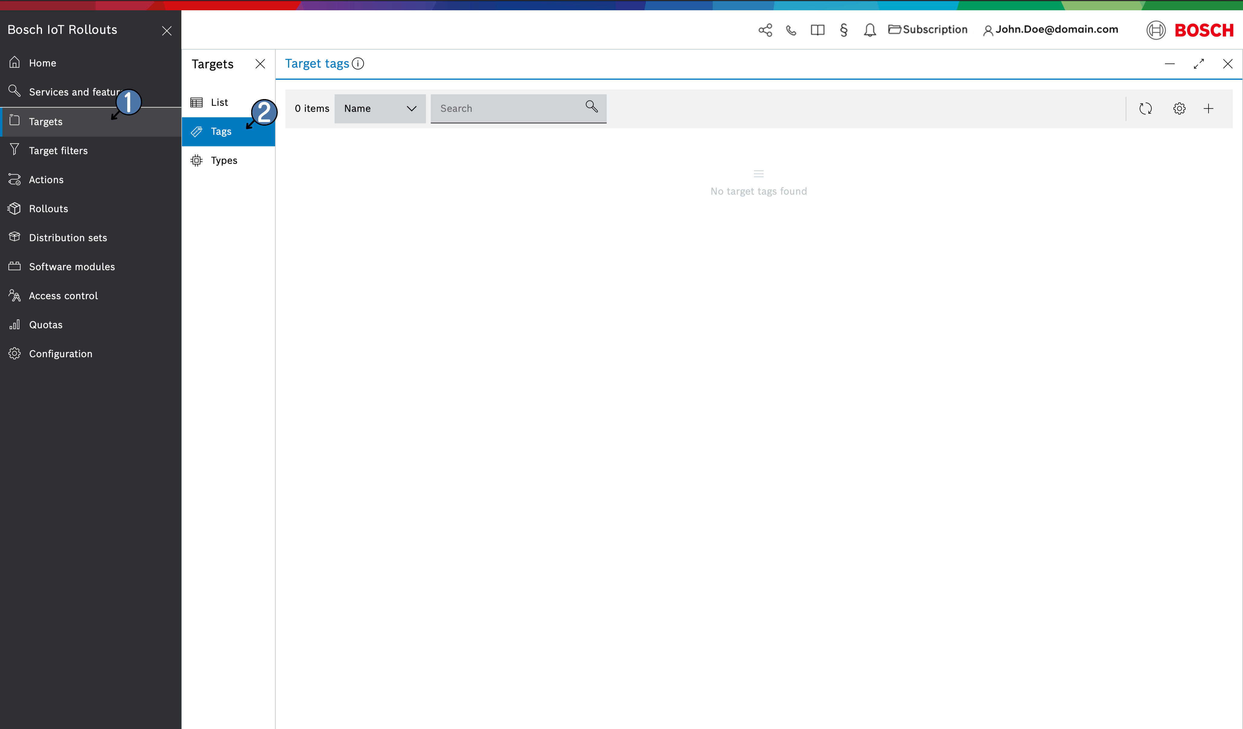 - Select Тags from the sub-navigation. The Target tags view will display a list of all existing tags.