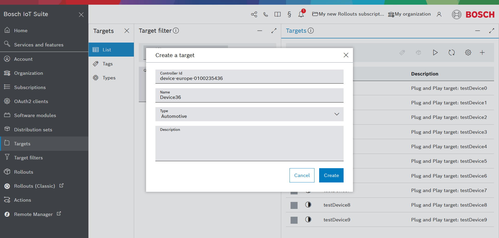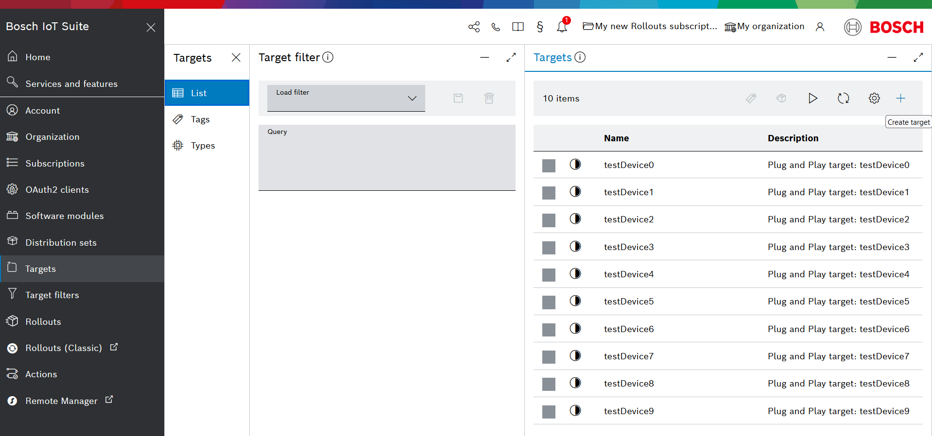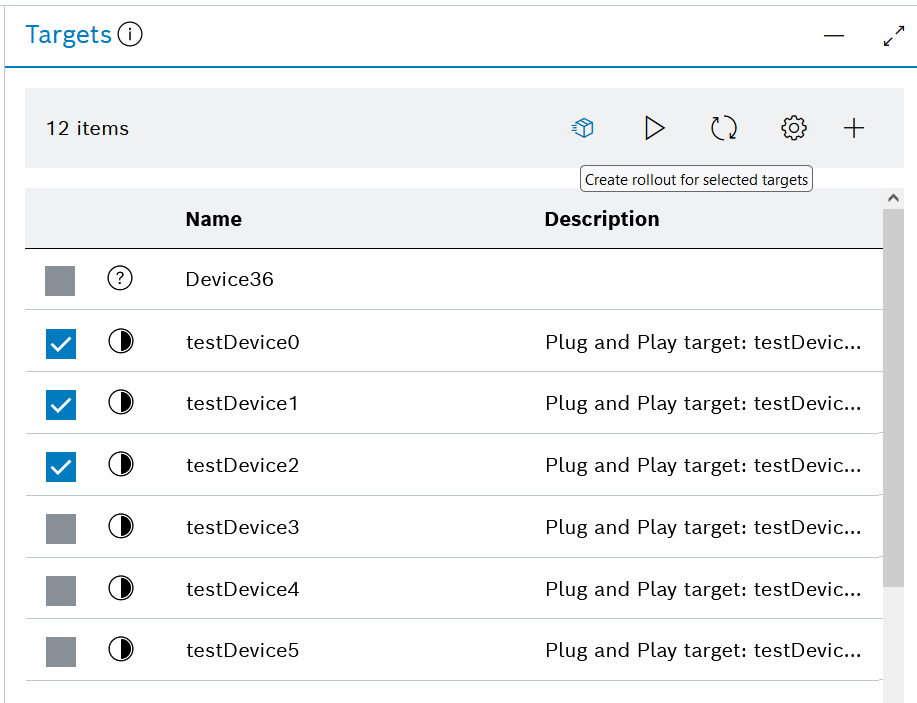 - Then click the first icon on top of the target list (icon tooltip saying Create rollout for selected targets).