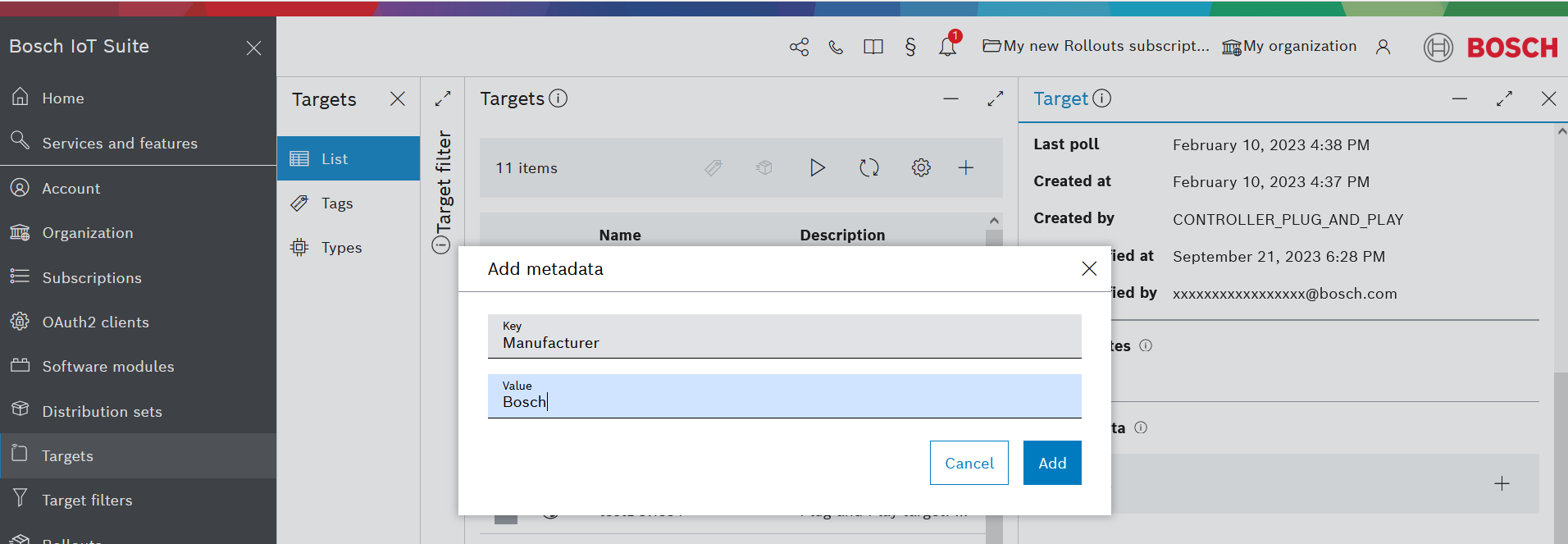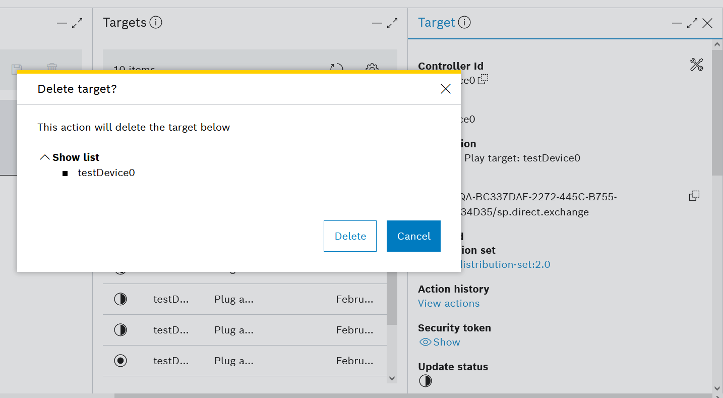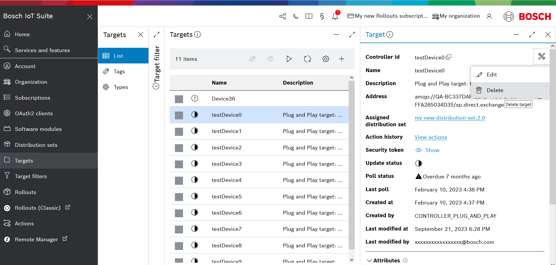 To delete a target from your service instance, select a target on the list and then open the target actions menu via the icon.
