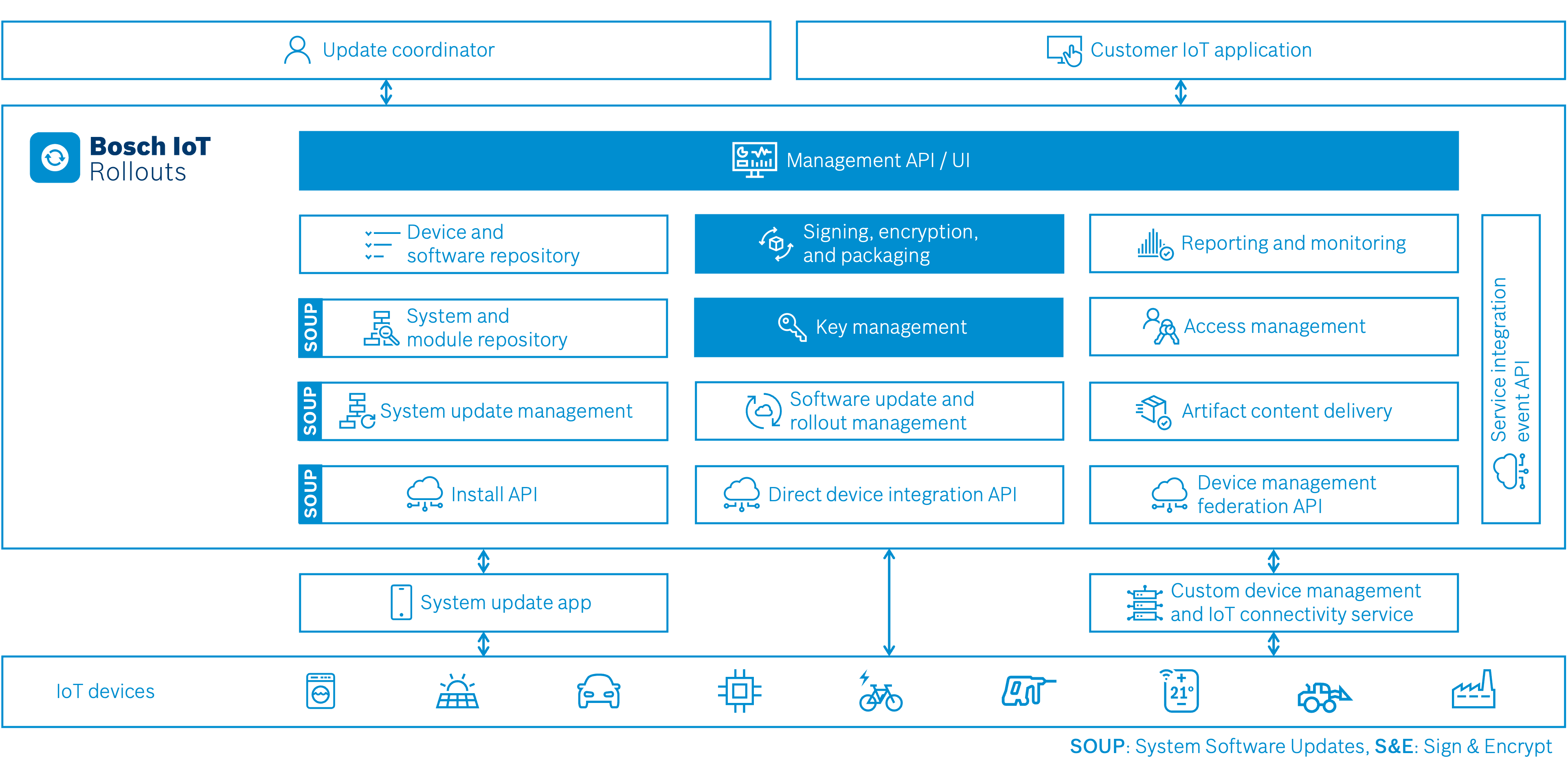 The Bosch IoT Rollouts Sign & Encrypt extension facilitates the creation of encrypted and signed firmware packages thus enabling secure software updates for the Internet of Things (IoT). That way it ensures the confidentiality, integrity, and authenticity of updates in a highly flexible, automated, content agnostic, and fine-grained manner.