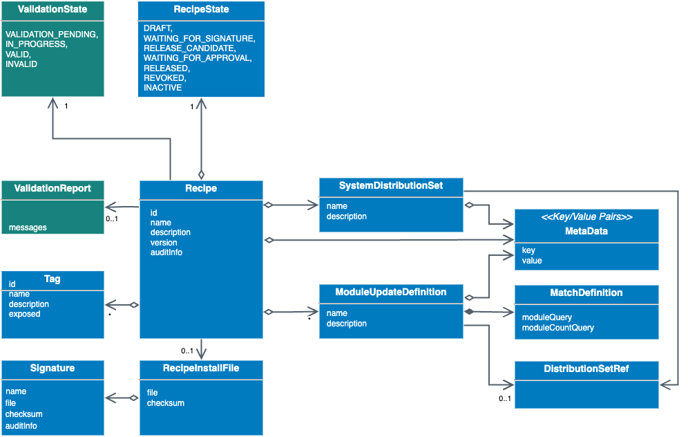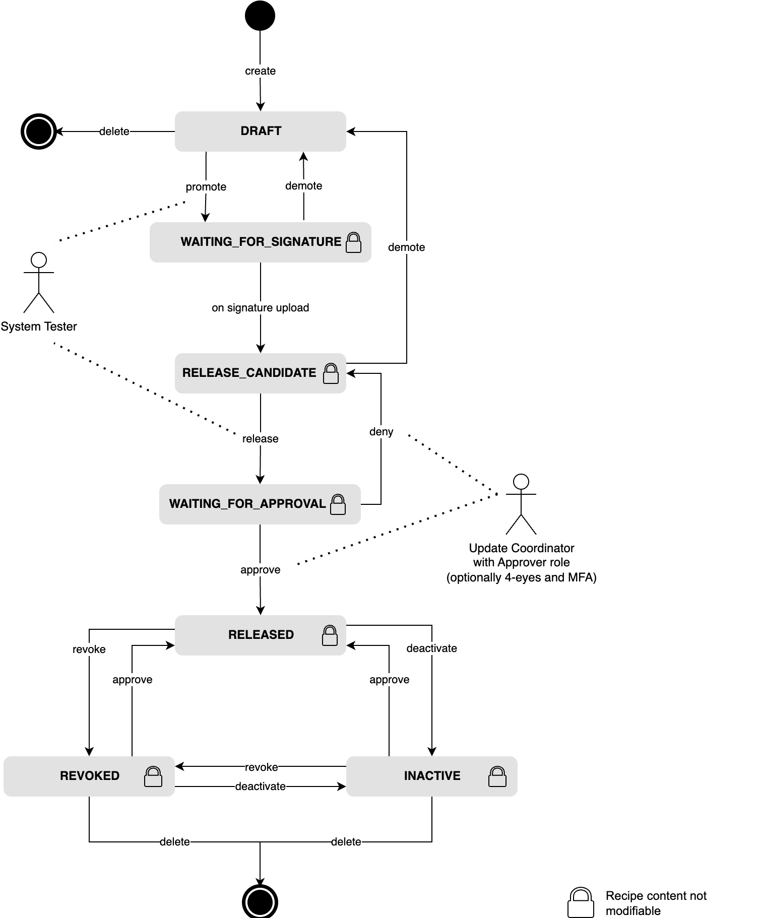 The following picture illustrates the lifecycle of a recipe. The state transition actions are typically triggered by a system responsible or update coordinator who is authorized to do so.