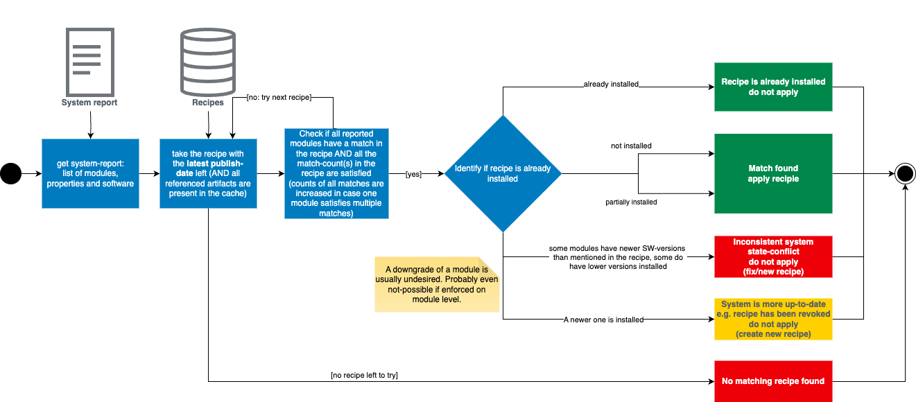 The recipe match algorithm describes how a matching recipe for a given system is identified. For a successful match, a recipe has a module update definition for every module within the system, satisfying both the match query and count requirements. In cases where multiple recipes could potentially match a system, the algorithm selects the most recent one based on its publish date. The algorithm is triggered automatically for