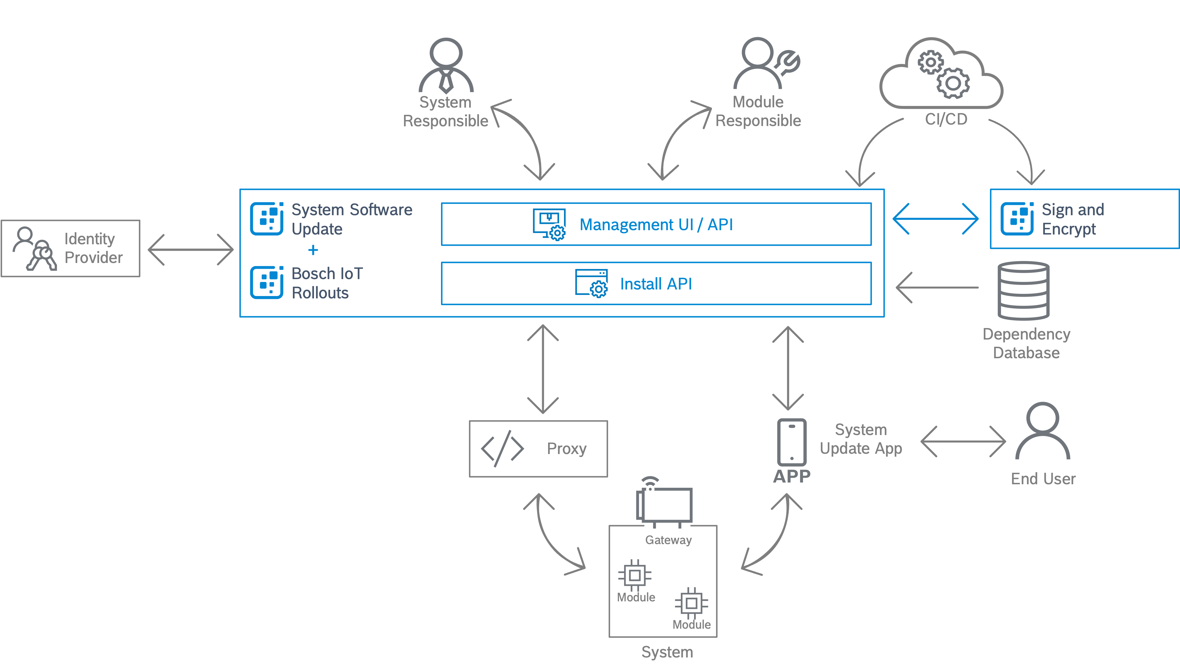The following is an architecture blueprint for a system software update solution highlighting the Bosch Digital services (colored in blue), as well as personas and components required from the customer side (colored in grey).