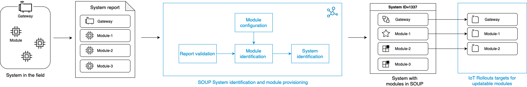 SOUP tracks and manages systems composed of interconnected modules. These systems are dynamically created or updated based on system reports you provide. Updatable modules are represented as targets within the IoT Rollouts service, allowing efficient updates and management. The following image provides a high-level overview of the system and module identification and provisioning within SOUP and IoT Rollouts.
