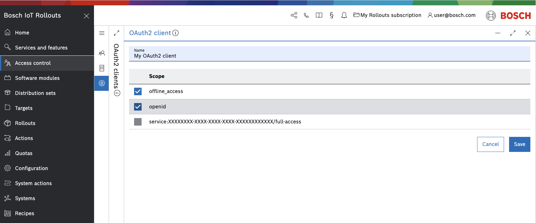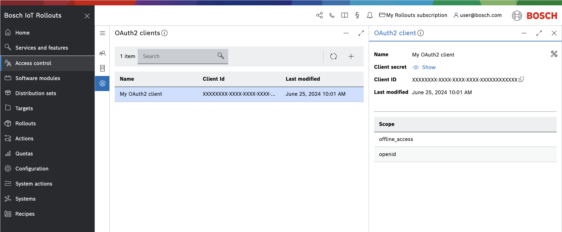 To create an OAuth2 client, enter the common Rollouts Management UI, navigate to Access control → OAuth2(https://console.eu1.bosch-iot-rollouts.com/access-control/oauth2-clients) from the left sidebar, or search for it in Services and features and if needed, use the star icon to pin it to the left navigation.