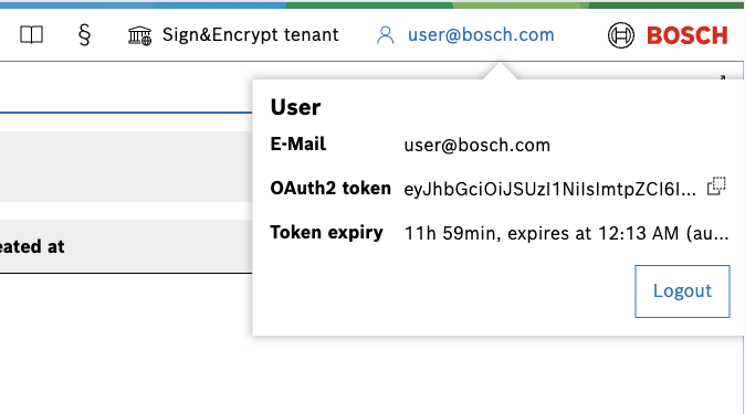 The User dialog in the header bar displays information about your currently used OAuth2 token and its expiry.