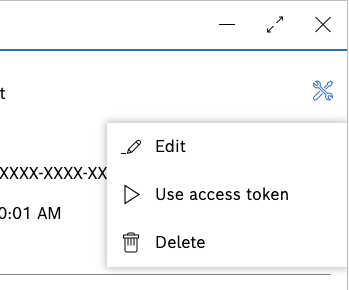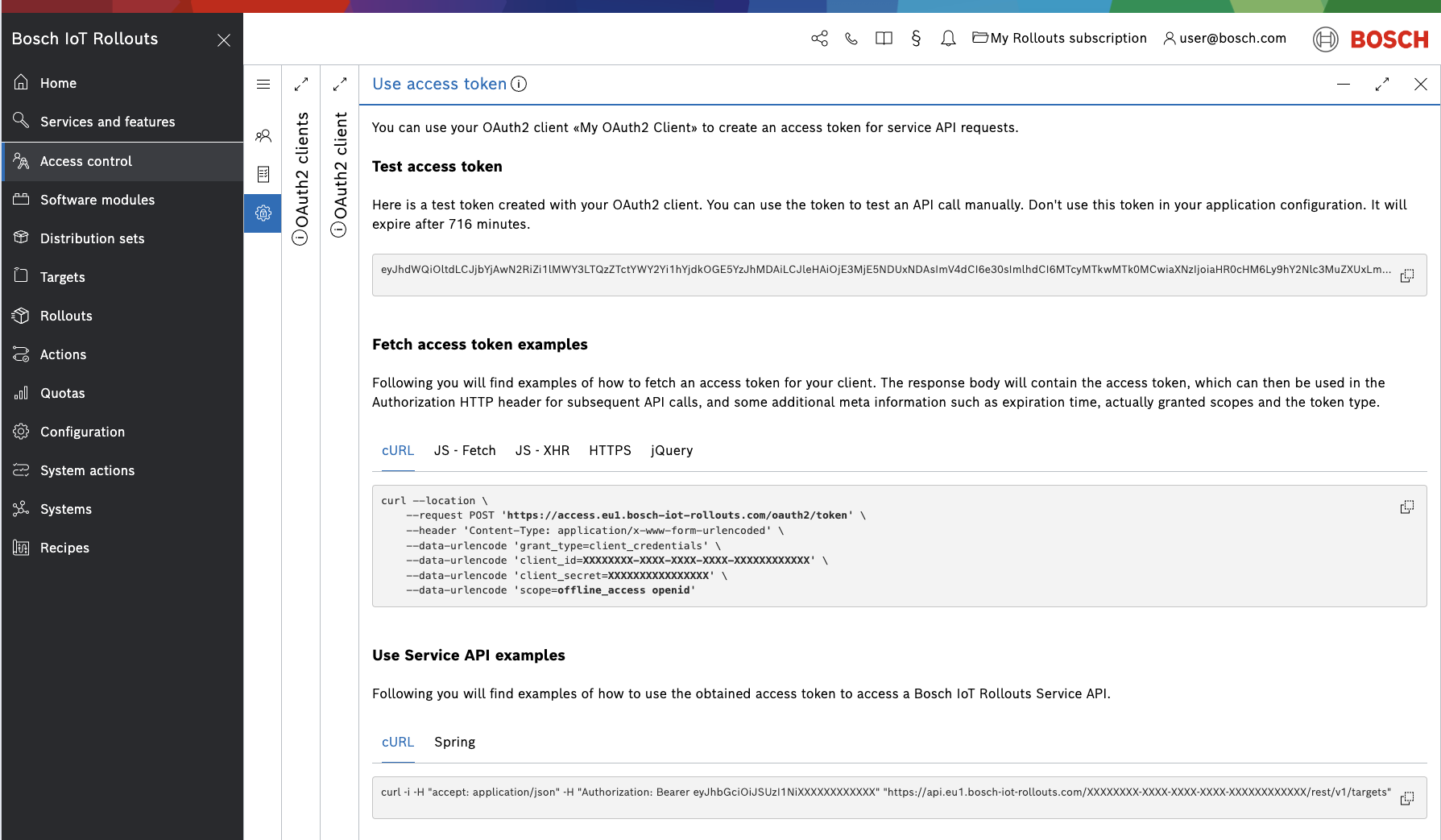 By clicking this action, you can obtain a test access token, along with examples of how to fetch an access token for your client, and how to use the obtained access token to access a Bosch IoT Rollouts Service API.