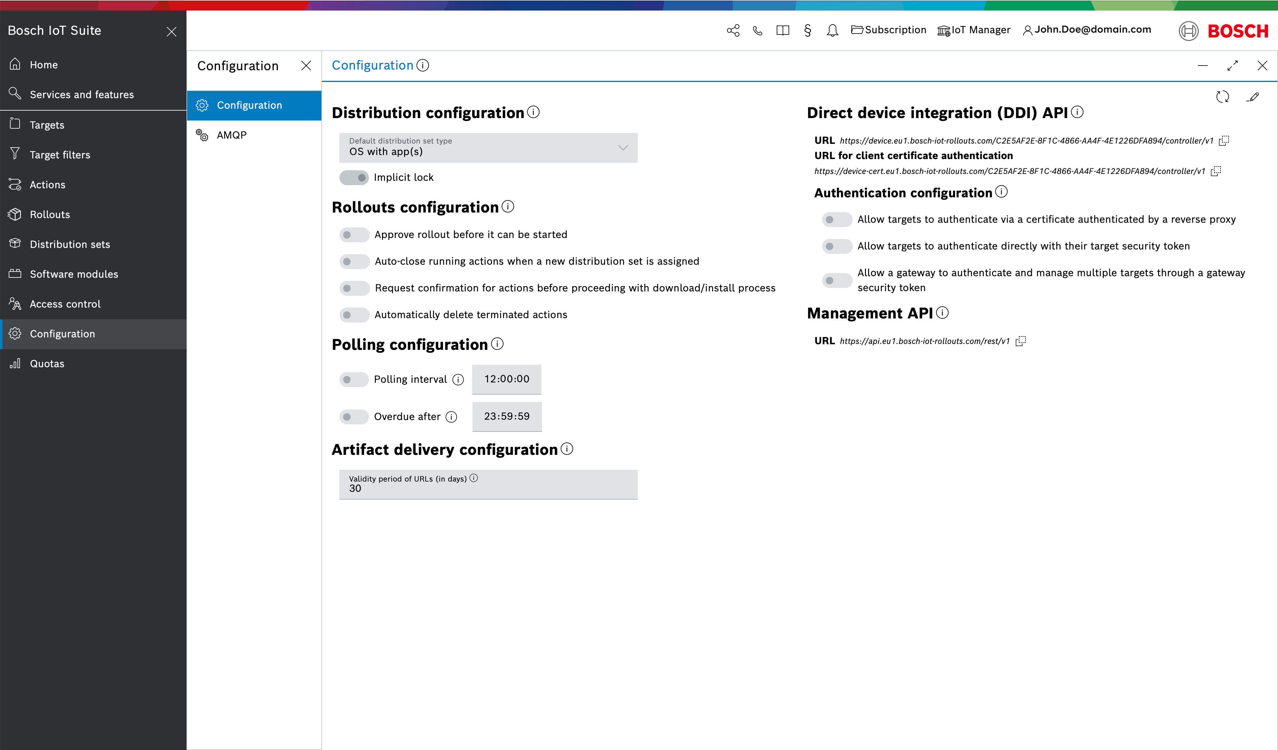 - A booked Bosch IoT Rollouts service instance on EU-1 or US-1.