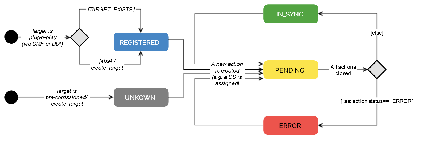UNKNOWN | Set by default for a pre-commissioned target until first status update received from the target. Is the initial starting point for targets created by UI or management API. | |