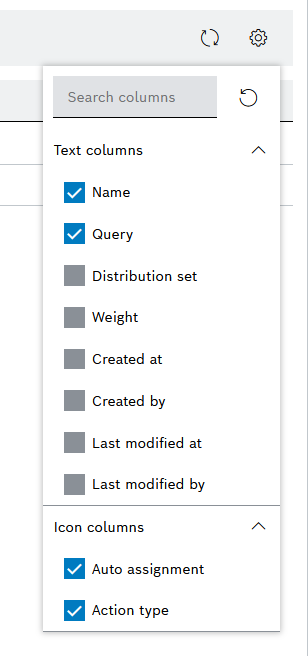 In this menu, you can also search for columns in the search bar and restore the default columns via the reset icon.