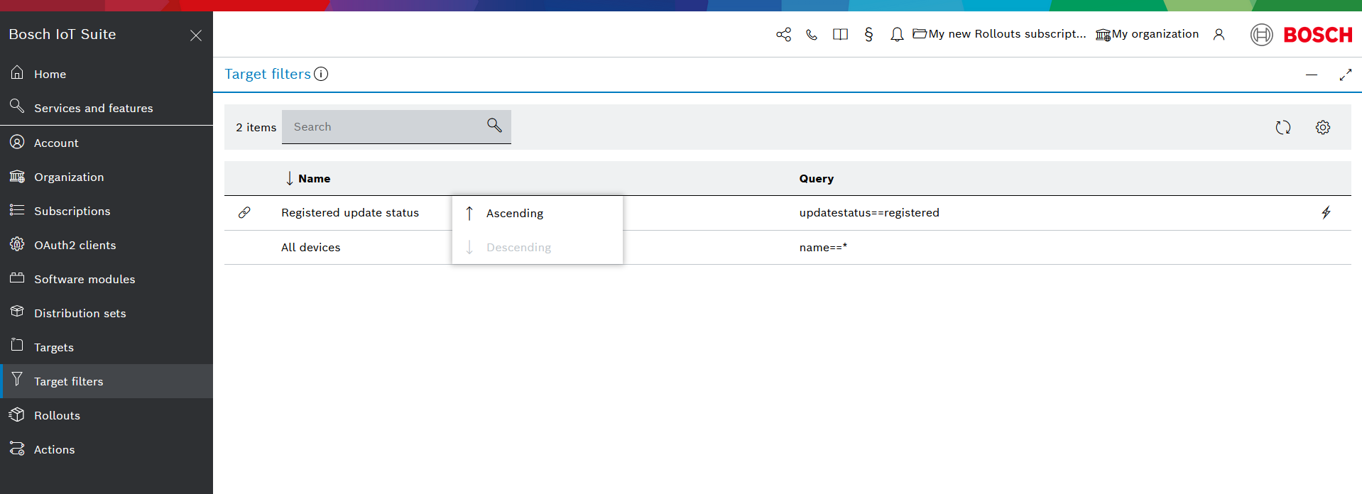 The Target filters view allows you to sort the target filters by name in an ascending or descending order. Just click the Name column and decide on the order.