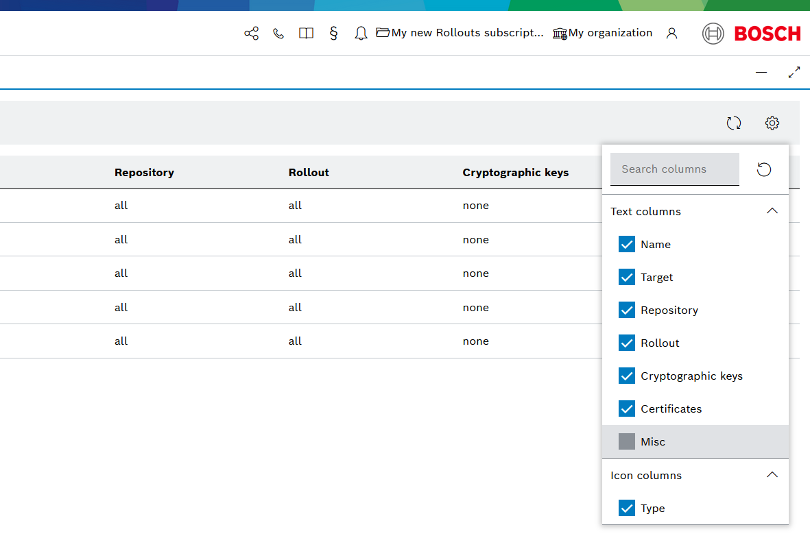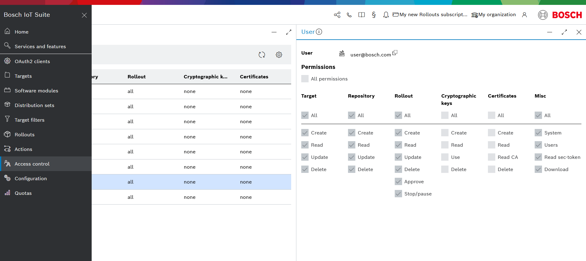 If a more fine-tuned approach was chosen then only the provided permissions' checkboxes (All, Create, Read, Update and Delete) will be ticked for each resource e.g. Target, Repository, Rollout, Cryptographic keys, Certificates and Misc.