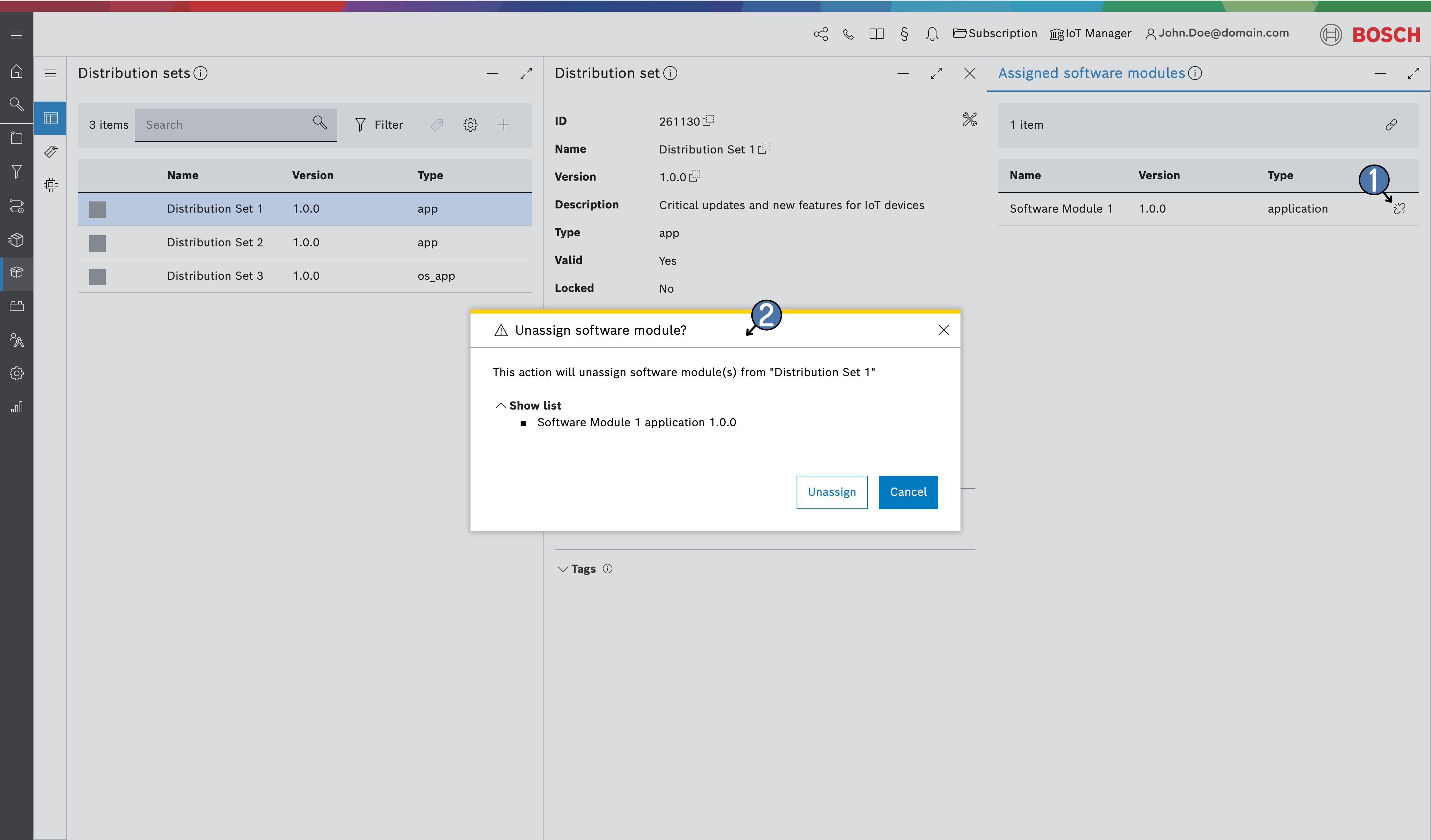 To unassign an already assigned software module, click the Unassign icon next to each software module on the list and confirm the action in the popup.